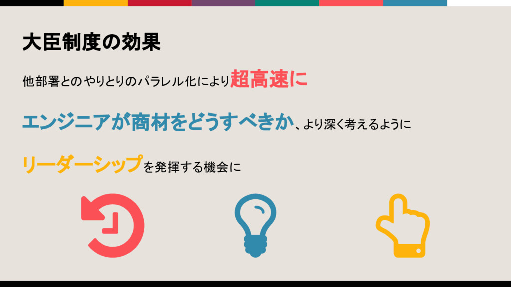 大臣制度の効果 他部署とのやりとりのパラレル化により超高速に エンジニアが商材をどうすべきか、より深く考えるように リーダーシップを発揮する機会に