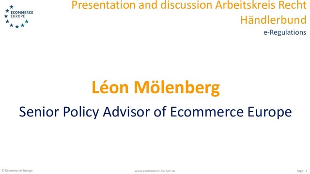 Evaluate the Consumer Rights Directive (CRD) rapidly • Simplify consumer rules • Fully harmonize legal framework for the sale of goods, services and digital content • Support for industry-led Trustmark schemes for B2C e-commerce Most recent actions: • Answer to EU Commission’s public consultation on contract rules for online purchases of digital content and tangible goods • Start our own evaluation of the CRD • Participate in ODR platform tests • Upcoming new Consumer Policies Position Paper The e-Regulations Working Committee Page: 12 2. Consumer policies