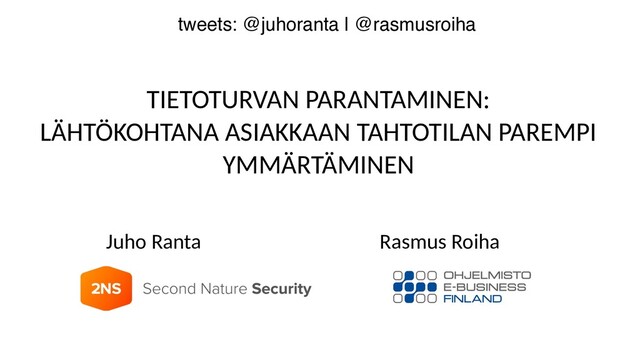 ja toimittajan välillä on harvoin sovittu yksiselitteisiä ja kattavia tietoturvavaatimuksia • Toimittaja ei tiedä, mikä asiakkaan tahtotila on • Asiakas ei osaa ostaa • Asiakas ei saa sitä, mitä haluaa
