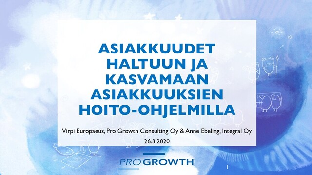 klousaa Activate •Segmentoi tavoitteiden mukaisesti Keep • Asiakkaan "opettaminen" yhteistyöhön Up-Sell •Asiakkuuden tukeminen segmenttikohtaisella hoitomallilla Next-Sell •Asiakasosuuden kasvattaminen, lisäarvon osoittaminen Cross-Sell •Suhdemarkkinoinnin kokonaisvaltainen johtaminen Referrals KASVATA HANKI Asiakkuuden synty Asiakkuuden jalostaminen Asiakkuuden kehittäminen Asiakkuuden lojaalisuus Asiakkuuden uusiutuminen Näkyminen hakutuloksissa Maksettu sem- tai somenäkyvyys Näkyminen sosiaalisessa mediassa (esim. Yrityksen oma Linkedin- päivitys) Sähköpostisuora Näkyvyys alan keskusteluissa Blogiartikkeli Pdf-opas Toimialan uusista ilmiöistä kertova somepäivitys Uutiskirje Prospektointi Linkedinissä Suosittelu (Virtuaali)tapaamisen sopiminen Tarjousprosessiin liittyvät digitaaliset markkinointisisällöt Tervetuloa asiakkaaksi paketti Asiakkuuden käynnistymisestä kiittäminen Asiakkaan tutustuttaminen kokonais- tarjoomaan (+edut) Asiakkaan käyttäjäkunnan tyytyväisyyden varmistaminen Asiakaskuuntelut Asiakasetujen kommunikointi (asiakassuhdetarjooman esille tuonti) Uutiskirjeet Webinaarit Tilaisuudet, tapahtumat Henkilökohtainen huomiointi ”Virtuaaliset vuosihuollot” ”Virtuaaliset asiakaspaneelit” Kontaktipinnan laajentaminen Uusien tuotteiden/palveluiden innovointi asiakkaan kanssa Asiakaspalvelussa asiakassuhteen huomioiminen ja ”hiljaisen tiedon” hankinta Murrostilanteiden johtaminen Kriittisten hetkien hoitaminen Suosittelujen pyytäminen. Suosittelijuudesta palkitseminen Lähtökyselyt ja –tarjoukset, paluukynnyksen madaltamine