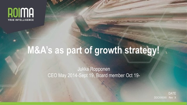 platform company • Fix basic business • New branding • Start M&A • Keep pushing on organic growth at the same time • Follow your plan, stick to your target customers Case Roima example