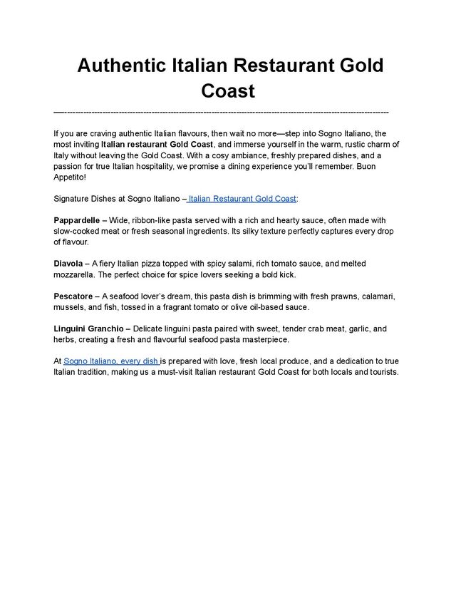 authentic Italian flavours, then wait no more—step into Sogno Italiano, the most inviting Italian restaurant Gold Coast, and immerse yourself in the warm, rustic charm of Italy without leaving the Gold Coast. With a cosy ambiance, freshly prepared dishes, and a passion for true Italian hospitality, we promise a dining experience you’ll remember. Buon Appetito! Signature Dishes at Sogno Italiano – Italian Restaurant Gold Coast: Pappardelle – Wide, ribbon-like pasta served with a rich and hearty sauce, often made with slow-cooked meat or fresh seasonal ingredients. Its silky texture perfectly captures every drop of flavour. Diavola – A fiery Italian pizza topped with spicy salami, rich tomato sauce, and melted mozzarella. The perfect choice for spice lovers seeking a bold kick. Pescatore – A seafood lover’s dream, this pasta dish is brimming with fresh prawns, calamari, mussels, and fish, tossed in a fragrant tomato or olive oil-based sauce. Linguini Granchio – Delicate linguini pasta paired with sweet, tender crab meat, garlic, and herbs, creating a fresh and flavourful seafood pasta masterpiece. At Sogno Italiano, every dish is prepared with love, fresh local produce, and a dedication to true Italian tradition, making us a must-visit Italian restaurant Gold Coast for both locals and tourists.
