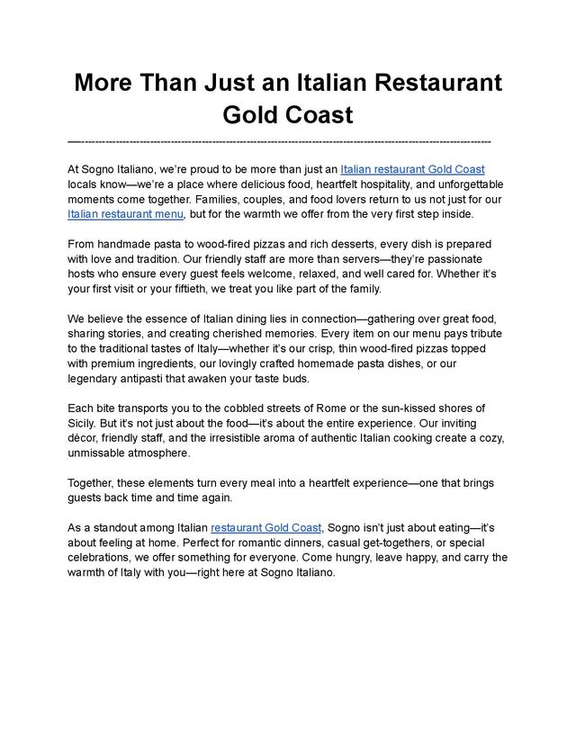 Sogno Italiano, we’re proud to be more than just an Italian restaurant Gold Coast locals know—we’re a place where delicious food, heartfelt hospitality, and unforgettable moments come together. Families, couples, and food lovers return to us not just for our Italian restaurant menu, but for the warmth we offer from the very first step inside. From handmade pasta to wood-fired pizzas and rich desserts, every dish is prepared with love and tradition. Our friendly staff are more than servers—they’re passionate hosts who ensure every guest feels welcome, relaxed, and well cared for. Whether it’s your first visit or your fiftieth, we treat you like part of the family. We believe the essence of Italian dining lies in connection—gathering over great food, sharing stories, and creating cherished memories. Every item on our menu pays tribute to the traditional tastes of Italy—whether it’s our crisp, thin wood-fired pizzas topped with premium ingredients, our lovingly crafted homemade pasta dishes, or our legendary antipasti that awaken your taste buds. Each bite transports you to the cobbled streets of Rome or the sun-kissed shores of Sicily. But it’s not just about the food—it’s about the entire experience. Our inviting décor, friendly staff, and the irresistible aroma of authentic Italian cooking create a cozy, unmissable atmosphere. Together, these elements turn every meal into a heartfelt experience—one that brings guests back time and time again. As a standout among Italian restaurant Gold Coast, Sogno isn’t just about eating—it’s about feeling at home. Perfect for romantic dinners, casual get-togethers, or special celebrations, we offer something for everyone. Come hungry, leave happy, and carry the warmth of Italy with you—right here at Sogno Italiano.