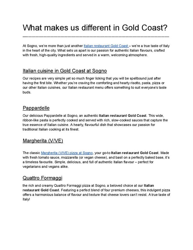 we’re more than just another Italian restaurant Gold Coast – we’re a true taste of Italy in the heart of the city. What sets us apart is our passion for authentic Italian flavours, crafted with fresh, high-quality ingredients and served in a warm, welcoming atmosphere. Italian cuisine in Gold Coast at Sogno Our recipes are very simple yet so much finger licking that you will be spellbound just after having the first bite. Whether you’re craving the comforting and hearty risotto, pasta, pizza or our other Italian cuisines, our Italian restaurant menu offers something to suit everyone’s taste buds. Pappardelle Our delicious Pappardelle at Sogno, an authentic Italian restaurant Gold Coast. This wide, ribbon-like pasta is perfectly cooked and served with rich, slow-cooked sauces that capture the true essence of Italian cuisine. A hearty, flavourful dish that showcases our passion for traditional Italian cooking at its finest. Margherita (V/VE) The classic Margherita (V/VE) pizza at Sogno, your go-to Italian restaurant Gold Coast. Made with fresh tomato sauce, mozzarella (or vegan cheese), and basil on a perfectly baked base, it’s a timeless favourite. Simple, delicious, and full of authentic Italian flavour – perfect for vegetarians and vegans alike. Quattro Formaggi the rich and creamy Quattro Formaggi pizza at Sogno, a beloved choice at our Italian restaurant Gold Coast. Featuring a perfect blend of four premium cheeses, this indulgent pizza offers a harmonious balance of flavour and texture that cheese lovers can’t resist. A true taste of Italy!