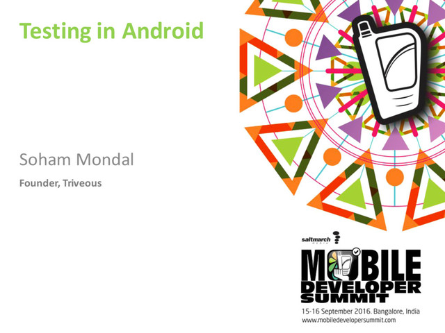 A presentation on Testing in Android presented at the Mobile developer summit 2016.