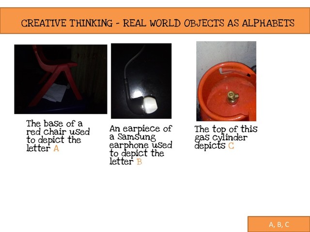 base of a red chair used to depict the letter A A, B, C An earpiece of a Samsung earphone used to depict the letter B The top of this gas cylinder depicts C