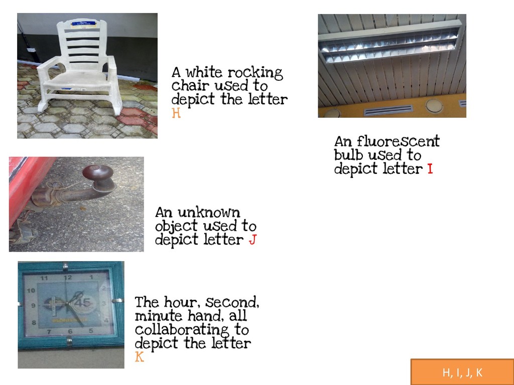 depict the letter H An unknown object used to depict letter J An fluorescent bulb used to depict letter I The hour, second, minute hand, all collaborating to depict the letter K