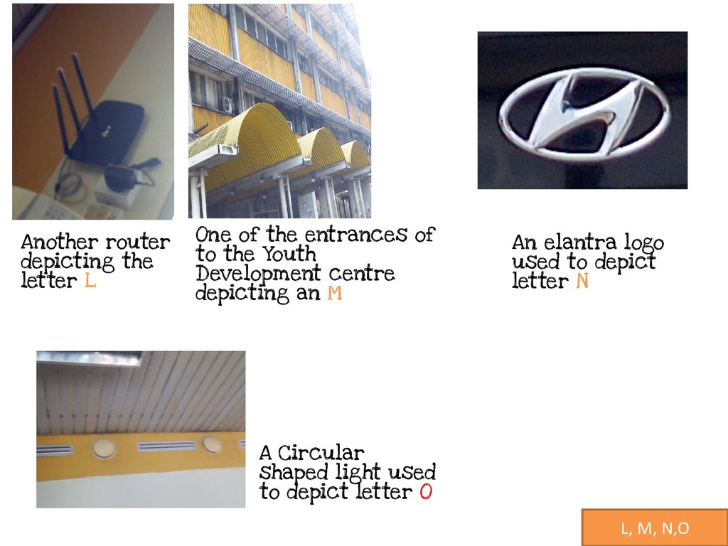 N A Circular shaped light used to depict letter O One of the entrances of to the Youth Development centre depicting an M Another router depicting the letter L