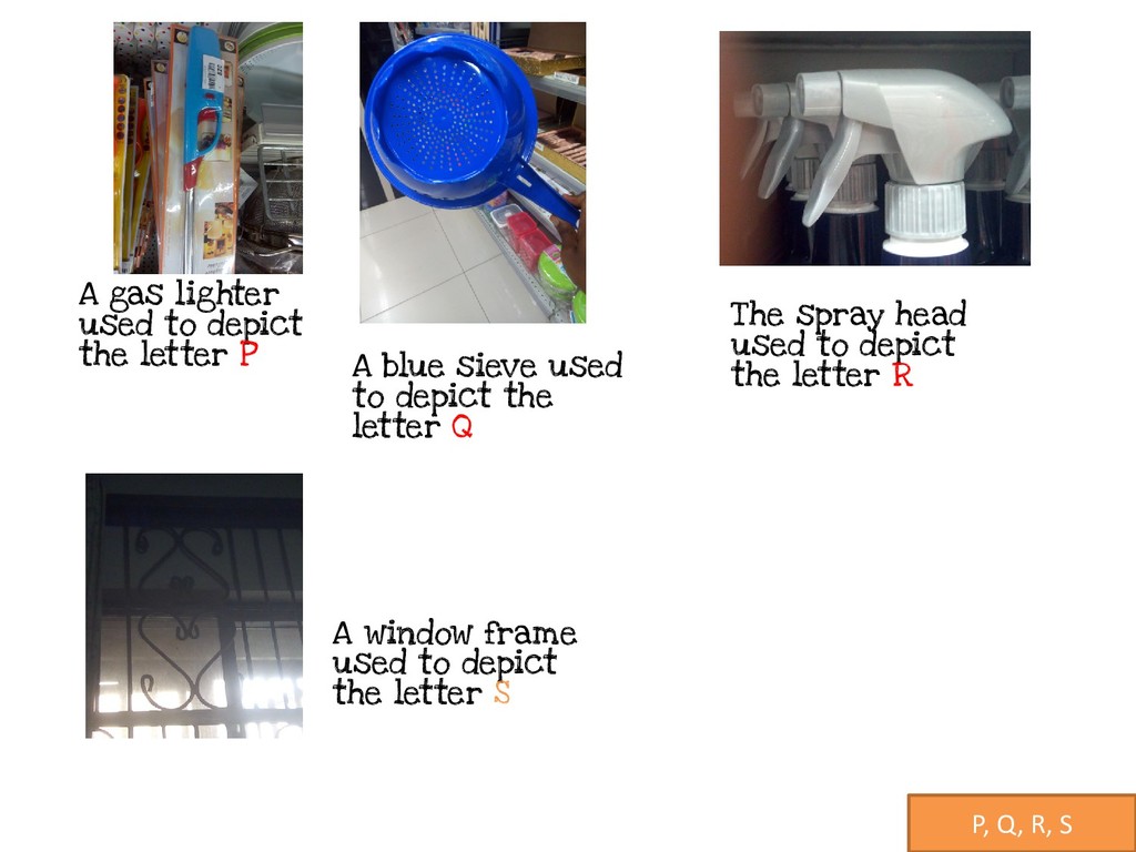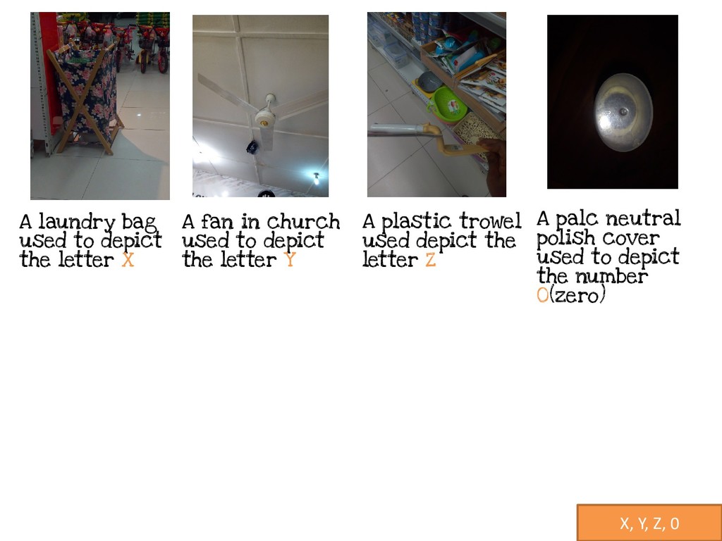 the letter X A fan in church used to depict the letter Y A plastic trowel used depict the letter Z A palc neutral polish cover used to depict the number 0(zero)