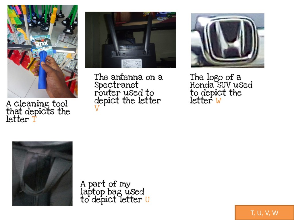 used to depict letter U The antenna on a Spectranet router used to depict the letter V The logo of a Honda SUV used to depict the letter W A cleaning tool that depicts the letter T