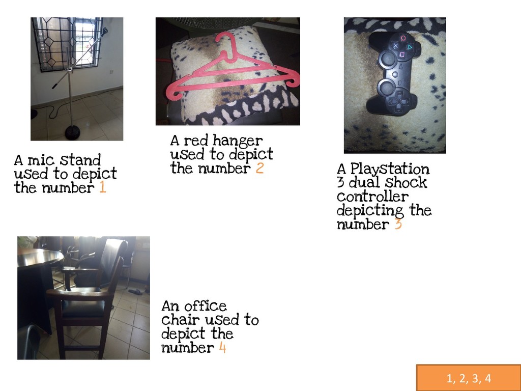 the number 1 An office chair used to depict the number 4 A Playstation 3 dual shock controller depicting the number 3 A red hanger used to depict the number 2