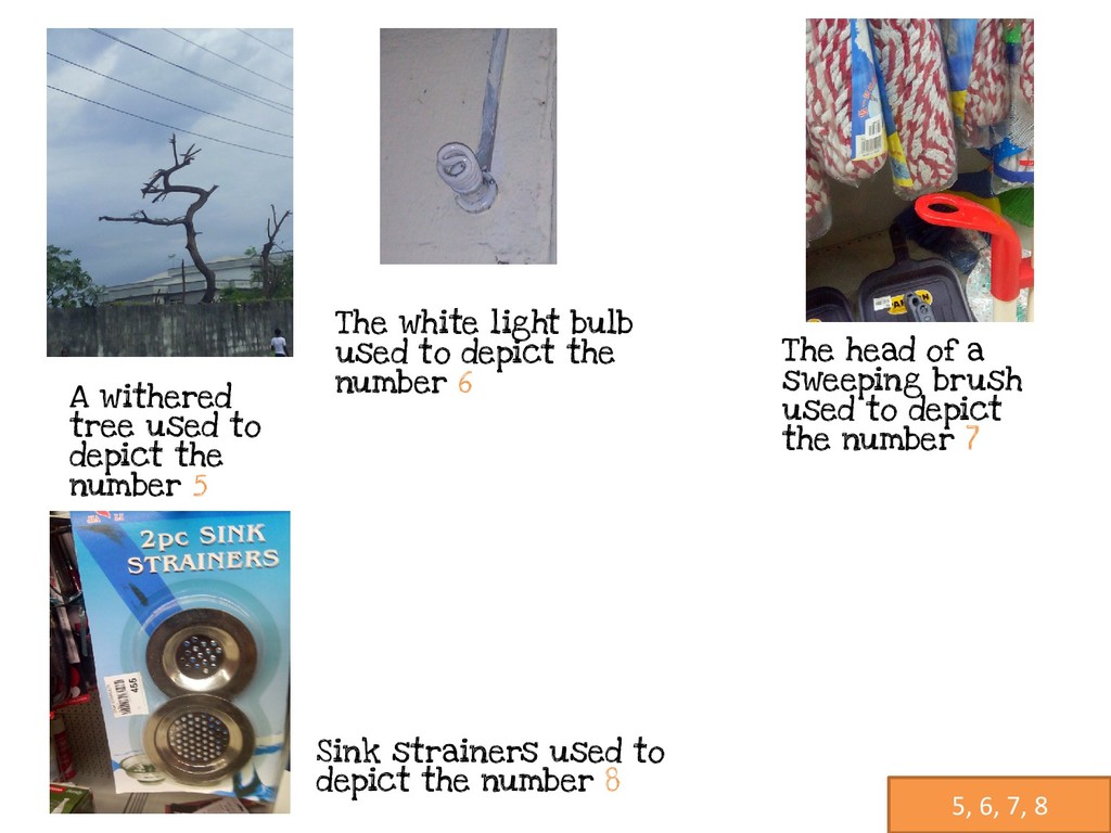 used to depict the number 7 Sink strainers used to depict the number 8 A withered tree used to depict the number 5 The white light bulb used to depict the number 6