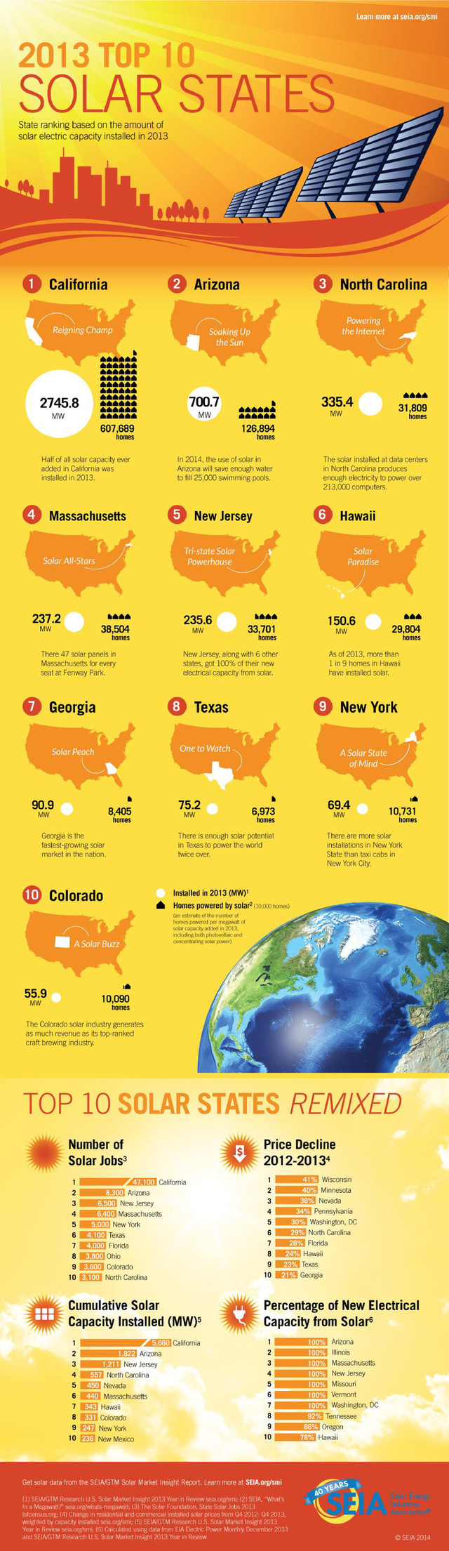 This infographic ranks the Top 10 Solar States based on solar capacity installed in 2013. It also includes the number of megawatts installed per state, number of houses powered per megawatt of solar added, and fun factoids for each state. We also show the rankings "remixed" based on number of solar jobs added in 2013, cumulative solar capacity, price decline, and percentage of new electricity generation from solar.