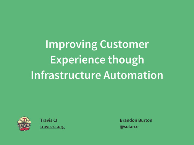 This talk will share some of the key automation objectives the build infrastructure engineering group at Travis CI is doing, the process and challenges we've encountered we figure out how to incorporate the larger focus into work planning, and what's being done to measure the actual customer impact of our new infrastructure automation changes.