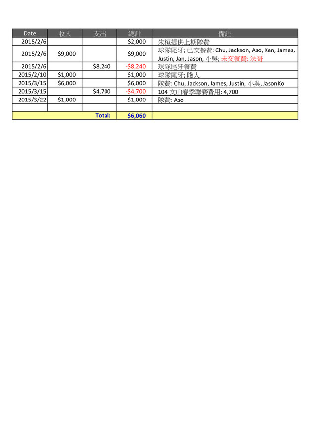 $9,000 球隊尾牙; 已交餐費: Chu, Jackson, Aso, Ken, James, Justin, Jan, Jason, 小吳; 未交餐費: 法哥 2015/2/6 $8,240 -$8,240 球隊尾牙餐費 2015/2/10 $1,000 $1,000 球隊尾牙; 賤人 2015/3/15 $6,000 $6,000 隊費: Chu, Jackson, James, Justin, 小吳, JasonKo 2015/3/15 $4,700 -$4,700 104 文山春季聯賽費用: 4,700 2015/3/22 $1,000 $1,000 隊費: Aso $6,060 Total: