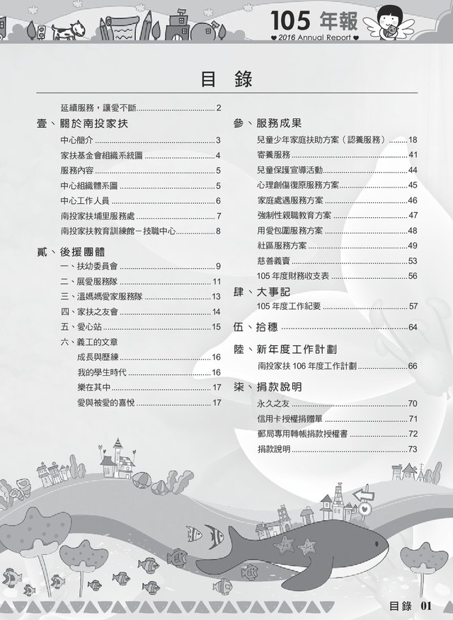 關,恢復家庭正常運作功能。南投家扶中心截至 105 年 12 月止,已協助發放 1,988,420 元的急難救 助金給予 302 戶家庭紓困,使得這些家庭獲得改善的契機,更讓人間增添許多溫暖。 扶 助 童 透 過 撰 寫 信 件 感 謝 各 單 位 所 給 予 的 協 助 單位 戶數 金額 淨土善心會 70 350,000 合富公司 69 250,000 思源科技公司 8 123,400 鼎一會計記帳事務所 10 30,000 大鼎清潔公司 12 216,000 白氏社會服務部 10 10,000 贖世會 8 75,000 愛樂遊公司 8 75,000 財團法人台北市 慈愛基金會 8 160,000 葉剛雄先生 2 10,000 林靜諭小姐 4 30,000 莊一中先生 4 25,000 汪兆榮先生 1 16,000 劉孟儒先生 2 12,000 劉美綾小姐 20 200,000 邱素蘭小姐 5 5,000 蔡秀麗小姐 1 2,020 林錦武先生 1 3,000 金多元珠寶藝品 百貨中心 2 10,000 洪管鎂小姐 7 50,000 林寶蓮小姐 2 10,000 盧一言先生 1 10,000 林俊彥先生 5 30,000 陳淑芳小姐 1 5,000 裕陞實業有限公司 1 5,000 南投南崗扶輪社 1 36,000 陞宏科技有限公司 1 2,000 施登尉先生 1 10,000 張秀英小姐 1 5,000 李如琳小姐 1 5,000 陳湘宜小姐 4 25,000 林蕭秀鑾小姐 1 5,000 林晏輕先生 2 11,200 吳丞騏先生 1 5,000 圓嘟嘟嬰兒用品店 2 21,800 廖福隆先生 5 30,000 林群佳先生 3 40,000 陳碧蓮小姐 1 10,000 吳傳薪先生 5 20,000 陳祖安先生 5 25,000 吳帛錦小姐 1 5,000 何昭曀小姐 1 5,000 陳宏偉先生 1 5,000 盧宛平先生 3 10,000 105 年度總計 302 戶 1,988,420 元