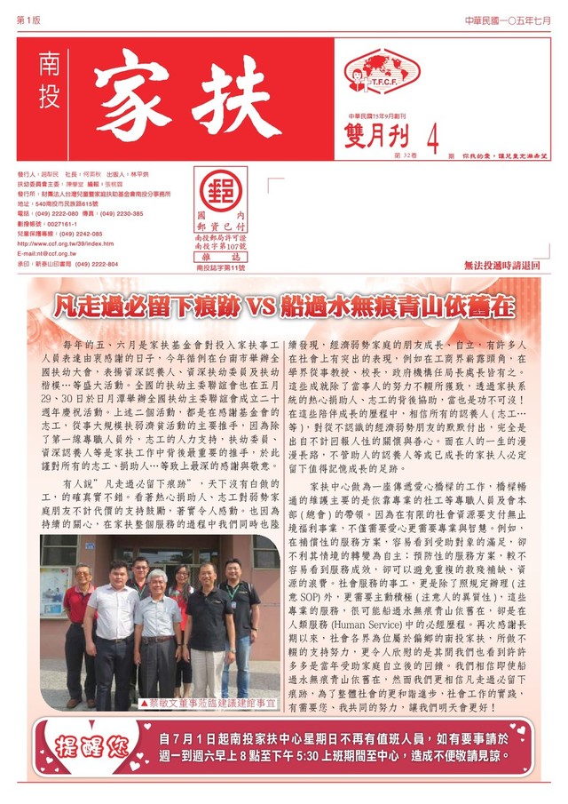 陳春美、陳柏羽、陳英義、 陳香如、陳財正、陳淑敏、 陳淑勳、陳傳銘、陳新庭、 陳煜仁、陳筱佩、陳緣璇、 陳燕珠、陳錦鳳、陳璧媛、 陳麗守、陳麗娟、勞翠鳳、 曾功銘、曾有村、曾麗鳳、 游凱傑、游慈卉、黃玉涵、 黃吉清、黃秀美、黃金鳳、 黃茂松、黃素香、黃素卿、 黃崇洧、黃淑雯、黃陸屏、 黃雪貞、黃富裕、黃惠瑜、 黃裕絹、黃榮美、黃德勝、 黃慧美、黃願霖、黃麗惠、 楊大慶、楊雅婷、楊錦科、 葉仲芸、葉光哲、葉芸安、 葉家勝、葉桂宜、董美辰、 詹秀足、廖宜逸、廖振勝、 廖秦櫳、廖朝園、廖維政、 廖賢堯、劉又慈、劉又瑄、 劉又銘、劉文基、劉順章、 劉榮泉、劉憲龍、劉豐源、 劉鎮豪、劉繼陽、劉耀祺、 潘承洁、潘歆妤、潘福吉、 練瑞標、蔡育蓁、蔡庚叡、 蔡欣妤、陳瑞瓊、蔡美玲、 蔡連坤、蔡銀秀、蔡璦綾、 蔡豐輿、鄭博仁、蕭采薇、 蕭淳中、賴宜志、賴素琴、 賴碧霞、賴蕎汸、薛汶芳、 謝佳雯、謝宗運、謝易廷、 謝淑貞、謝照安、謝慶芸、 謝曉甄、鍾淑芬、簡文宏、 簡玉粧、簡美鳳、簡素每、 藍子淇、藍子琁、藍麗冠、 魏伶如、魏春花、羅玉春、 羅志承、羅家峻、羅智義、 蘇婉婷、蔡孟軒 ( 蔡孟哲 )、 阿田農場、李白碧珠、洪 盧文里、高羅嘉萍、陳周 雪梅、劉楊秀枝、蔡洪秋 女、豐寶藝品、林賴招娣 ( 林 榮 芹 )、 熱 心 人 士 ( 埔 里 )、四七軒禮品行、釔達 有限公司、埔里國中 812、 Q BABY 生活百貨館、巴塞 隆納管委會、友泰益工程有 限公司、大瑞空壓機械有限 公司 - 湯雯麗、南投社區大 學 Photoshop 名間班 1,053 元 埔里國中 915 課輔班全體 1,100 元 / 潘信雄、潘敬融 先生紀念基金 1,117 元 / 謝百城 1,200 元 卜英傑、王韋翰、吳啟男、 吳清流、林其原、林孟穎、 林春齊、施美智、洪貴蘭、 高家鼎、張至伶、張廷宇、 張宗容、張韶予、陳文欽、 陳崇志、黃淑慧、黃瑞豐、 葉黎娟、賴來淵、謝榮興、 藍啟芳、藍鈺瑩、魏月英、 翁秉榮 ( 翁廷佐 )、張綿嬌 ( 吳漢陸 . 吳芷瑩 ) 、歐陽 翠翠、寶榮有限公司、頂鑫 會計記帳事務所 1,240 元 / 陳柏瑜 . 陳雨彤 1,304 元 光華國小二年 2 班 1,320 元 陳嘉魁 ( 鄒 烽 ) 伉儷 1,400 元 / 徐志瑋、張簡能祥 1,500 元 朱舒嫻、吳名驊、周芳涪、 林旺熠、洪幸妙、袁子瑩、 張洋祐、張美裕、梁玉靜、 陳美盛、陳啟昇、黃榮德、 廖憲璋、蔡麗美、蕭靜淑、 簡麗美、簡靈藝、許國賢 ( 洪千惠 )、趙榮裕 ( 曾明進 ) 、南投社區大學 Photoshop 南投班 1,600 元 徐璽棻 . 徐承學、陳碧娟 1,700 元 光華國小二年 3 班 1,702 元 光華國小三年 4 班 1,800 元 / 吳美芳 1,900 元 / 吳彬國、吳雪娥 2,000 元 阿 雄、鍾 墉、王文龍、 王妙彥、王秀玲、王承亮、 王建國、王啟川、王莒茵、 王靜梅、王瓊慧、王麗玉、 石柳棻、朱子倩、江家瑜、 何長勳、何家澤、何錦水、 吳文濱、吳岳鴻、吳俊榕、 吳俊霖、吳國重、吳清金、 吳進發、吳瑄騏、吳靜婷、 吳霽庭、呂坤記、呂榮懋、 呂鳳秋、呂艷萍、宋昇翰、 李昀庭、李昕昕、李長盛、 李宥澄、李珮瑜、李婉玉、 李瑪莉、李優美、李麗金、 沈佑叡、沈錦勳、卓佑晟、 卓鴻佑、周元松、周百泉、 林其賢、林宜樺、林芬柔、 林芮辰、林俊元、林建元、 林苡蓁、林恩至、林泰甫、 林淵洲、林貴文、林福生、 邱文卿、邱婷婷、施萬成、 施簡哖、柯添讚、洪玉鑾、 洪瑛璘、洪銘村、徐秋香、 涂金票、崔靜薇、張士魁、 張同佑、張明賢、張紅玉、 張淑春、張進芳、凃雅玲、 張達成、張鳳和、張穗勳、 梁恬漪、陳慧寧、游承恩、 莊明錫、莊雅青、莊銘仁、 許文興、許尚緯、許旌英、 郭念融、陳仁彰、陳文苑、 陳文鯓、陳宇男、陳奇宏、 陳怡珍、陳昆郁、陳怜嬙、 陳建昇、陳泰宇、陳偉穗、 陳淑敏、陳慧津、陳麗芳、 石隆政、石哲安、曾中正、 曾仁柏、田慧雯、曾昱睿、 曾光曜、曾志聰、曾雪枝、 曾艷秋、游延煌、游炤棠、 游黎郁、程集總、黃國書、 黃翊峰、黃毓莉、黃靚宜、 黃寶聯、楊文輝、賴慧瑜、 楊振成、萬陳快、葉佳玫、 葉國華、葉瑞惠、廖本榕、 廖正美、廖素端、廖龍佐、 廖麗玉、褚忠進、趙永誠、 趙進福、趙薇媗、劉聰海、 蔣玉惠、蔡正億、蔡光超、 蔡秉寰、蔡貞復、鄭耀祥、 鄧元璋、鄧同木、盧美華、 蕭汝經、蕭秀妙、蕭英文、 賴允德、賴瑾螢、巫欣蓉、 賴卉珊、賴秀卿、錢麗鎂、 龍曉雷、謝秀旻、謝坤山、 謝忠勝、謝明良、謝建鑫、 謝通儒、謝富田、謝樹木、 鍾阿來、韓易達、簡詩展、 藍慧君、顏菁瑩、魏汝超、 羅娟娟、羅濟鎮、蘇木祥、 蘇忠正、蘇泳瑞、蘇威豪、 蘇威憲、蘇彥霖、蘇炫百、 蘇筱媛、鐘善雄、蕭信爐 ( 蕭 創仁 )、藍明恩 ( 林淑玲 )、 李見來 ( 李劉甚 ) 伉儷、李 光田 ( 李承澔 . 李承翔 )、陳 尹棨 ( 林素珍 . 陳夢陽 . 陳尹 修 ) 、陳和男 ( 張翠蘭 . 陳炫 諭 . 陳炫錡 )、友德意麵、許 史秋子、蔡林美悅、宏駿彩 券行、侑睿有限公司、新泰 山印書局、榮晟有限公司、 勇志汽車材料行、文龍食品 有限公司、宗稼實業有限公 司、祥榮建設有限公司、富 聖紙業有限公司、嘉義縣服 務站 ( 張天能 )、金鼎建材企 業有限公司、卉林企業股份 有限公司、國立台灣大學南 投地區校友會 2,100 元 / 蔡淑津 2,200 元 / 吳仲康、梁炳勛 2,210 元 / 