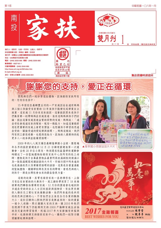 元 / 南投縣愛心會草屯區 6,740 元 / 新興國小 6,850 元 / 營北里歌唱班 7,490 元 / 長樂天然菇類農 場 - 許倉嘉 7,585 元 / 陳輔弼 8,825 元 / 鄭琬諭 9,030 元 新振發食品有限公司 9,410 元 / 王志汎、楊盛隆 10,000元/ 王思萍、 邱郡柔、 洪志富、洪芷萱、南投律師 公會、昇萌股份有限公司、 雙聖農產品加工廠、高豐實 業 ( 股 ) 公司、瀚霖投資顧問 有限公司、金牌大師食品科 技有限公司 10,170 元 / 黃振華代書事務所 10,200 元 / 松柏嶺獅子會 10,335 元 / 張曉珊 10,480 元 / 瀚霖不動產仲介 經紀有限公司 10,500 元 / 黃安琪 10,620 元 / 肯美特材料科技 ( 股 ) 公司 11,000 元 / 甘瓏實業有限公司 11,610 元 富邦人壽南投通訊處 12,305 元 富邦人壽投富通訊處 12,495 元 台灣浩壹股份有限公司 13,200 元 / 鄭憲欣 15,000元/ 王思怡、 邱秀鳳、 邱柏翔、張秋田 15,275 元 / 瀚霖開發有限公司 18,564 元 / 松大數位有限公司 20,000 元 / 邱憲正、駿宏燈 光音響有限公司 20,442 元 / 南投縣政府警察 局南投分局 23,595 元 / 鄭博文 24,575 元 / 苔曙企業股份有 限公司 30,000 元 / 林慧美 33,955 元 / 興霖食品股份有 限公司 36,275 元 / 利登企業有限公司 40,000 元 / 林世彬、梁然奕 41,200 元 /chj 布工坊 45,007 元 / 台灣佛教慈濟慈 善事業基金會(草屯聯絡處) 50,000 元 王勝煌、周信利、羅炳梧、 環偉實業 ( 股 ) 公司、彰化 縣育達慈善會 50,002 元 / 南投縣愛心會南 投區 56,348 元 / 小磨坊國際貿易 股份有限公司 60,000 元 / 陳玄欽 68,380 元 日勝化工 ( 股 ) 公司 100,000 元 飾鴻實業有限公司 320,701 元 / 張仁吉 ◎活動捐款 - 扶幼委員專款 1,668 元 / 徐昌義 10,000元/ 王勝華、 余源森、 吳大村、吳大芳、吳東亮、 吳瑞龍、吳賜福、周進科、 林丕弘、林吉常、林志勇、 林傑凱、徐福欽、張文招、 許永昌、郭芳敬、野鴨谷、 陳金珠、陳政亨、陳泉源、 陳源和、陳霓瑄、陳豐裁、 陳豐遜、陳麗琍、彭慶龍、 曾孝明、曾金蓮、黃志輝、 黃金發、黃浩庭、黃進能、 黃誌明、楊國珍、葉耀明、 詹登雲、廖智孝、劉振明、 劉錦城、歐木松、潘月英、 潘建忠、蔡瑞聖、蕭國俊、 戴正修、簡慈慧、建美銀 樓、欣山園餐廳、吉詳有限 公司、林冠岐養生美容坊、 豐晟汽車有限公司、國堡營 造工程有限公司 ◎活動捐款 - 冬令營贊助款 1,000 元 / 埔里塔羅當舖 2,000 元 / 龍呈營造有限公 司、瑞溪營造股份有限公司 10,000 元 財團法人埔里鎮恒吉宮 ◎活動捐款 - 義賣贊助款 18,872 元 / 熱心人士 ( 埔里 ) ◎活動捐款 - 茶葉義賣活動 300 元 / 劉美芝 500 元 / 劉文萍 600 元 / 蔡文明 900 元 / 林炳喜 1,000 元 / 徐麗花 1,500 元 / 李致豪 1,800 元 / 賴欣遙 2,000 元 / 朱挺儀、林武雄、 黃碧蓮、廖芬綺、劉至善 3,000 元 許麗雀、財團法人台灣兒童 暨家庭扶助基金會附設台中 市私立家扶發展學園 3,500 元 / 廖宜蓮 4,000 元 / 劉國璋 4,500 元 / 翁慧圓 4,800 元 / 施阿錢 5,000 元 / 郭文蓮、安富不 動產有限公司 ◎活動捐款 - 義購園遊券 2,000 元 / 呂佩璇 10,000 元 / 聯瑩紙器股份有 限公司 11,800 元 / 網隆實業有限公司 20,000 元 / 楷翔實業有限公司 32,000 元 / 呂添榮 105,000 元 / 飾鴻實業有限 公司 ◎轉帳收入 - 其他 86,146 元 / 財團法人台灣兒 童暨家庭扶助基金會 ◎活動捐款 2,000 元 / 祇園念佛功德會 3,000 元 / 朱育慧 ◎政府補助 - 寄養招募、審 查、研習、聯誼及評估會議 43,032 元 / 南投縣政府 ◎政府補助 - 家庭處遇服務費 894,989 元 / 南投縣政府 ◎政府委託代發收入 寄養服務費 44,300 元 / 台南市政府 2,561,281 元 / 南投縣政府 ◎政府委託代發收入 寄養童健保費 13,482 元 / 南投縣政府 ◎活動收費 - 相見歡報名費 1,680 元 / 田家逢 2,270 元 / 丁慶媛 ◎政府補助 - 高風險家庭 服務方案 161,748 元 / 南投縣政府 ◎扶幼捐款 - 發票中獎 200 元 / 江小姐、李佾達、 汪敏華、姚惠文、徐嘉成、 陳林妮、程玉燕、廖彩惠、 林美雲 ( 溫媽媽 )、師母小舖 400 元 / 卓羽婷、董桂伃、 廖志學、鄭博元、戴芳惠、 簡玉瓶、熱心人士 ( 埔里 )、 力行會計事務所、菓風小舖 ( 股 ) 公司、永盛體育文教 用品名店、財政部中區國稅 局彰化分局、寶島光學科技 ( 股 ) 公司草屯分公司 600 元 張光耀、莫那魯道商行 800 元 / 王雅婷、百鋒加油 站有限公司 1,200 元 / 梁 明、陽明隱形 眼鏡有限公司 1,600 元 / 廖昌宏、陳孝恩 ( 陳雁雅 . 陳若宇 ) 1,800 元 埔里酒廠仁愛基金 2,600 元 / 熱心人士 3,400 元 / 日月潭國際花火 音樂暨自行車嘉年華 18,600 元 南投縣政府稅務局 ◎活動捐款 - 購沙拉油贊助款 3,000 元 / 柳桂三 ◎活動捐款 埔里園遊會贊助款 200 元 / 盧美麗 3,000 元 / 國姓鄉公所 4,000 元 / 黎彥村 5,000 元 / 埔里鎮公所 ◎教育訓練館 - 建館經費 1,000 元 / 吳心琳、吳芷萱、 吳俊待、吳柏勳、簡蕙蒨 ◎活動捐款 - 兒保購物袋 1,712 元 / 陳玲圓 ◎無窮世代 - 家扶娃娃撲滿 800 元 / 黃德章、廖敏芝實 實物捐贈明細 105.11.01 ~ 105.12.31 捐贈白米(每包3.4公斤) 1 包 / 尤淑暖、李念恩、陳 碧惠、趙子翔 2 包 吳 絨、辜 却、黃 女、 蔣 雙、丁有勝、丁美毓、 尤美黛、尤楷勛、王文君、 王文意、王建凱、王禹鈞、 王淑美、王郭秋、王雅姿、 王綵涵、王綺秀、王獻忠、 古珮吟、田虹芬、石漢傑、 朱冠畇、朱貫彰、朱富義、 朱瑞情、朱雙龍、江秀月、 何明珠、余依桓、吳元榮、 吳名爵、吳宇廷