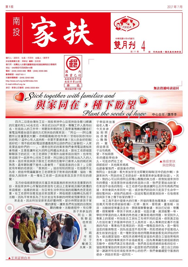 陳韋利 / 楊哥楊嫂肉粽 2 盒、組合粽 2 組、吉祥如意年菜 1 組 陳靜玟 / 衛生紙 1 箱、布諾午茶糕點 2 盒 陳鴻文 / 創世基金會園遊會卷 10 張 陳政良 / 飲料 74 罐 善心人士 / 穀物水果麥片 62 包、粽子 80 顆、大炒菜鍋 1 個、瓦 斯快速爐 1 台、蓮子米香 30 包 善心人士 / 佛祖心雜誌 100 本、二手衣 2 箱、二手衣 1 批、關廟麵 1901 份、調合油 1901 瓶、 竹塘好米 12 公斤、契作香 米 18 公斤、後山星願糙米 4 公斤、後山星願米 10 公 斤、有機小蕃茄 12 箱、有 機蘿蔔 1 批、餅乾 1 批、茄 子 1 批、兒童玩具及玩偶 1 批、炒麵 6 盒、蕃茄 16 箱、 饅頭 1 批、穀物水果麥片 (黃金蕃薯)62 包 程藍瑩 / 粽子 100 顆 黃本丸 / 飯糰 80 顆 黃柏瑄(黃柏嘉)/ 蜜粉餅 7 盒 黃景輝 / 牙膏 5 條、黑米 5 斤 黃沁玲 / 蜜豆奶 72 罐 黃閎鉉 / 尿布 M 號 2 包 李進遠、戴淑君、林秀珍、 陳見早、林江賜、宋秀華、 陳王明岳 / 蛋糕 8 個 孫于純 / 創世基金會園遊會卷 20 張 蔡忠穎 / 布偶 4 個 張家銘 / 玩具 1 批 張西村 / 蔬菜餅干 100 盒 梵心閣 / 肉粽 5 包 蕭美錦 / 麵包餐盒 24 盒、葡萄柚 6 顆 彭慧蘭 / 二手衣(物)1 批、5 件新 T 恤 曾聖斌 / 穀物水果麥片 3 包 楊英斌 / 尿布 NB*3 箱、尿布 S*3 箱、 尿布 M*3 箱、尿布 L*2 箱、 尿布 XL*2 箱 楊宥臻 / 40 人份大電鍋一台 楊桂惠 / 品客洋芋罐 16 罐、優酪乳 18 罐 蔡少虹、李乙霈 / 鳳梨酥禮盒 2 盒 蔡佩珊 / 肉鬆御飯糰 14 個、鮪魚御 飯糰 10 個 盧宜君 / 二手(物)1 批 盧崇榮 / 茶包 22 盒 賴小姐 /0-1 歲安全座椅 2 台 賴志松 / 肉粽 2 包 簡華生、吳佩怡、簡榮柏 / 新衣 3 件 蕭士凱 / 沐浴乳 13 瓶、牙膏 2 條 顏世泰 / 糖果 1 盒 魏秀梅 / 十 全 十 美 郵 票( 面 額 100 元)43 張 釋如證(師父)/ 被子 8 件 水里商工 / 團謄 52 份 友德意麵 / 麵條 100 斤 天香茶行 / 保久乳 2 箱 文仁銀樓 / 粽子 100 顆 恩頡商行 / 穀物水果麥片 35 包 香港商利標品牌亞洲有限公 司台灣分公司 / 衣服 21 件、褲子 3 件、鞋 子 23 雙、雜物 1 批 台灣萊雅股份有限公司 / 理膚寶水保養品組 8 組 台中市新民高中中三乙 / 二手物資乙批 甲聖工業 ( 股 ) 公司 / 克寧奶粉 36 罐 字村珍饌會館 / 祭拜物品 1 批 宏大烘焙行 / 小漢堡 240 顆 法蘭司烘焙有限公司 / 麵包 30 條 金能工業 ( 股 ) 公司 / 水果 18 箱 南投楓康超市 / 粽子 120 顆 南投縣小英之友會 / 園遊卷 50 張 津有春茵場 / 金針菇 5 公斤 埔里鎮愛蘭里里長辦公室 / 肉粽 173 顆 夏洛蒂烘焙坊 / 肉粽 3 包 家樂福 / 大披蕯 10 個、蛋糕 3 個 耕坊行股份有限公司 / 脆妮妮米餅盒裝起司 48 盒 財團法人基督教宇宙光全人 關懷機構 / 愛嚇人的刺刺 200 本 盛達企業 / 餅乾 74 包、果凍 8 包、麵 條 13 包、水果軟糖 2 包 鹿港影武者 - 許東明 / 外套 64 件 超盛號 / 白蔭油 2 箱、醬油 5 瓶、黑 麻油 1 瓶 敬洋股份有限公司 / 糖果 47 包 鎂佳機械 / 香米 56 公斤、胚芽米 32 公斤 鑫僑鞋業有限公司 / 鞋子 38 雙 +1 支 衆晟國際有限公司 / 毛毯 200 件 好味自助餐 / 炒飯 161 盒 大倉企業有限公司 / 糧源九九禮盒 96 盒 新北市晶象關懷慈善協會 / 關廟麵 6 包、沙拉油 6 瓶 基督教救世軍 - 埔里 / 麵包飲料餐盒共 50 份 馥珍饌喜餅糕點烘培工坊 / 糕餅 16 盒 桌遊工作坊的各位 / 玩具 1 批 茶湯會股份有限公司 / 樂事試吃包 100 箱 成功體育 / 背包 11 個、羽球拍 2 組、 護具 40 個、溜冰鞋 1 組、 桌球網 3 個、球 15 顆、羽 球 1 組、桌球拍 5 支、小白 板 2 個、口風琴 4 個、泳帽 8 個、泳鏡 10 個、棒球 10 顆、清潔濕巾 1 缶、掛鈎 8 組、球袋 2 個、跳繩 10 條、 造型磁性夾 2 組、隨意貼雙 面膠片 2 組、彩繪筆 1 組又 18 支、白板筆 3 支、桌墊 1 個、粉筆夾 1 個、鉛筆 5 組、 粉蠟筆 6 盒 梅桂服飾 / 兒童四角褲 22 件、兒童三 角褲 24 件、成人四角褲 22 件、成人三角褲 310 件 好味自助餐 / 炒飯餐盒 83 盒 暨大曬物節 / 玩偶乙批 晴畊、賴品客 / 玉米乙批 捐發票助學工程明細表 ◆ 05~06 月份捐贈之統一發票 1 張 / 簡玉瓶、洪枝煌、三寶功德會 2 張 / 黃惠英 4 張 / 王雅婷、夜市義賣 ( 草鞋墩 人文觀光夜市 ) 5 張 / 周德成 10 張 / 劉謂華、顏世泰 17 張 / 南投休息站義賣 20 張 / 寶島光學科技 ( 股 ) 公司 ( 南 投分公司 ) 23 張 / 小林鐘錶眼鏡 ( 股 ) 公司 ( 南 投復興分公司 )、岐伯中藥房 24 張 / 魏季李、張簡能詳 27 張 / 家樂福義賣 28 張 / 洪政毅、旭達事業股份有限 公司 31 張 / 張碧理 35 張 / 力行會計事務所 36 張 / 林光暉 52 張 / 劉圜奮 54 張 / 梁文齡 62 張 / 熱心人士 ( 埔里 ) 87 張 / 埔里酒廠仁愛基金 97 張 / 黃惠珠 121 張 / 張俊惠 149 張 / 德豐藥品股份有限公司 159 張 / 埔里鎮農會購物中心 161 張 /8DTea 164 張 / 埔里酒廠仁愛基金(女兒紅) 183 張 / 永盛體育文教用品名店 195 張 / 國立暨南國際大學國際企業 學系黃品豪 273 張 / 福洲藥品有限公司 ( 福倫藥 局 ) 370 張 / 熱心人士 ( 埔里 ) 398 張 / 台電明潭發電廠職工福利社 634 張 / 百鋒加油站有限公司 788 張 / 埔里酒廠仁愛基金(枝仔冰- 陳先生 ) 1082 張 / 菓風小舖 ( 股 ) 公 司 2825 張 / 南投縣政府稅務局 5 月份財務報告 ▲ 5 月份共扶助一般認養 3145 名兒童 , 發放兒童生活 補助費 7,109,400 元 , 代墊扶 助金 232,900 元 , 特別禮金 發放 705,700 元 , 急難救助 金支出 144,000 元 , 獎助學 金支出 56,000 元 , 方案支出 995,115 元 , 專 業 人 員 薪 津 2,4