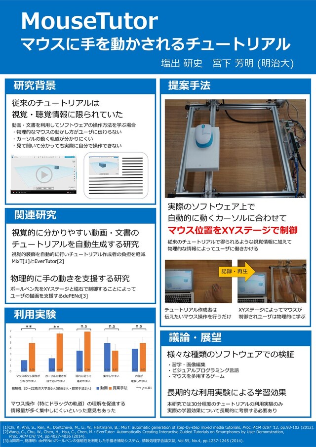 動画・文書を利用してソフトウェアの操作方法を学ぶ場合 ・物理的なマウスの動かし方がユーザに伝わらない ・カーソルの動く軌道が分かりにくい ・見て聞いて分かっても実際に自分で操作できない 提案手法 実際のソフトウェア上で 自動的に動くカーソルに合わせて マウス位置をXYステージで制御 記録・再生 チュートリアル作成者は 伝えたいマウス操作を行うだけ XYステージによってマウスが 制御されユーザは物理的に学ぶ 利用実験 2.00 2.33 3.67 5.00 4.00 5.00 6.67 7.00 3.67 5.00 0 1 2 3 4 5 6 7 マウスボタン操作が 分かりやすい カーソルの動きが 目で追いやすい 流れに従って 進めやすい 集中しやすい 内容が 理解しやすい 動画 提案手法 マウス操作(特にドラッグの軌道)の理解を促進する 情報量が多く集中しにくいといった意見もあった 議論・展望 様々な種類のソフトウェアでの検証 本研究では30分程度のチュートリアルの利用実験のみ 実際の学習効果について長期的に考察する必要あり 長期的な利用実験による学習効果 ‣習字・画像編集 ‣ビジュアルプログラミング言語 ‣マウスを多用するゲーム [1]Chi, P., Ahn, S., Ren, A., Dontcheva, M., Li, W., Hartmann, B.: MixT: automatic generation of step-by-step mixed media tutorials, Proc. ACM UIST ’12, pp.93-102 (2012). [2]Wang, C., Chu, W., Chen, H., Hsu, C., Chen, M.: EverTutor: Automatically Creating Interactive Guided Tutorials on Smartphones by User Demonstration, Proc. ACM CHI ’14, pp.4027-4036 (2014). [3]山岡潤一,筧康明: dePENd:ボールペンの強磁性を利用した手描き補助システム, 情報処理学会論文誌, Vol.55, No.4, pp.1237-1245 (2014). 視覚的に分かりやすい動画・文書の チュートリアルを自動生成する研究 視覚的装飾を自動的に行いチュートリアル作成者の負担を軽減 MixT[1]とEverTutor[2] 物理的に手の動きを支援する研究 ボールペン先をXYステージと磁石で制御することによって ユーザの描画を支援するdePENd[3] 関連研究 ** ** n.s n.s n.s **: p<.01 被験者: 20~22歳の大学生6人(動画3人・提案手法3人) 従来のチュートリアルで得られるような視覚情報に加えて 物理的な情報によってユーザに働きかける