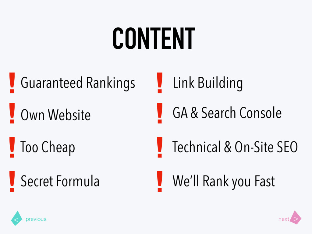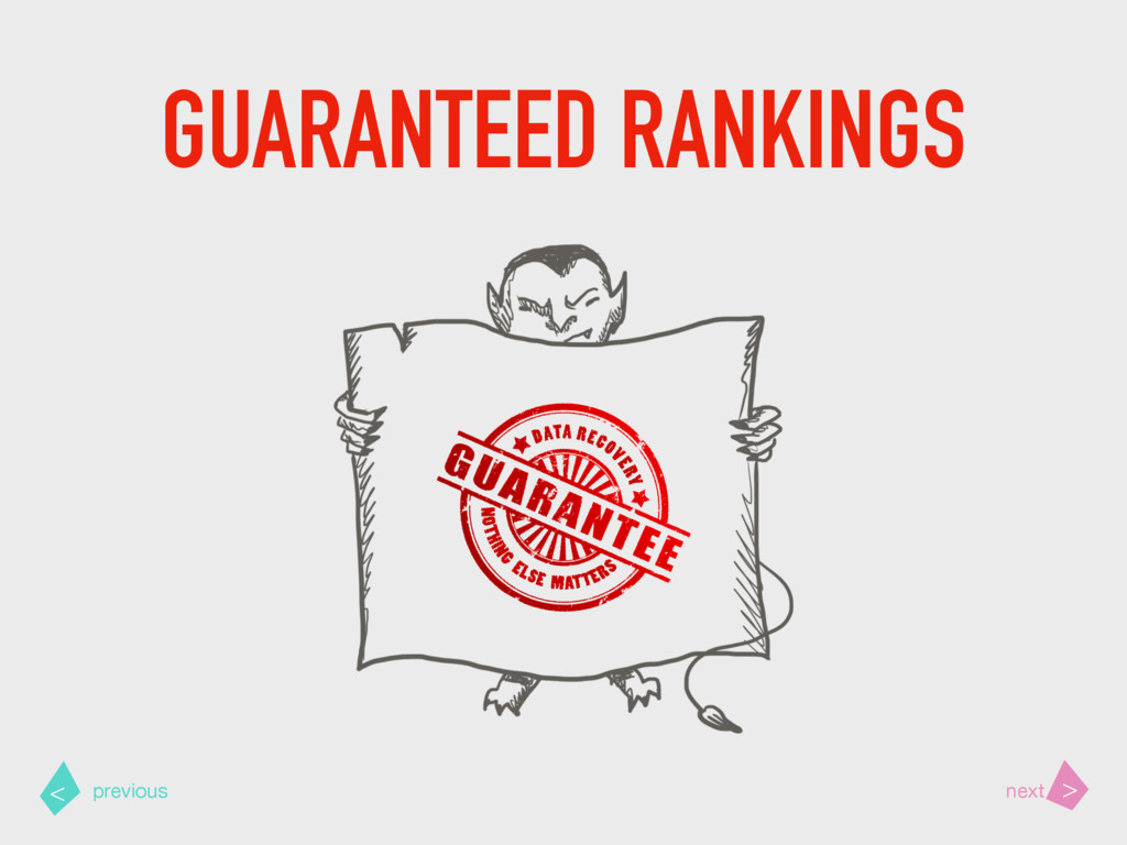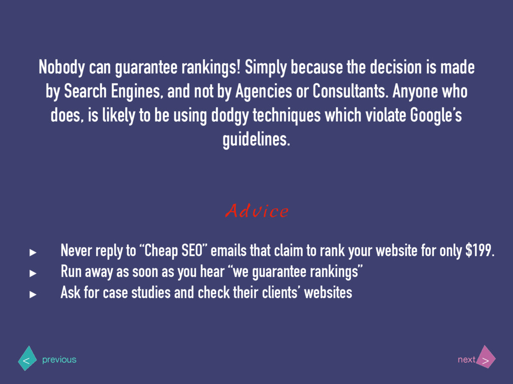 the decision is made by Search Engines, and not by Agencies or Consultants. Anyone who does, is likely to be using dodgy techniques which violate Google’s guidelines. ‣ Never reply to “Cheap SEO” emails that claim to rank your website for only $199. ‣ Run away as soon as you hear “we guarantee rankings” ‣ Ask for case studies and check their clients’ websites Advice