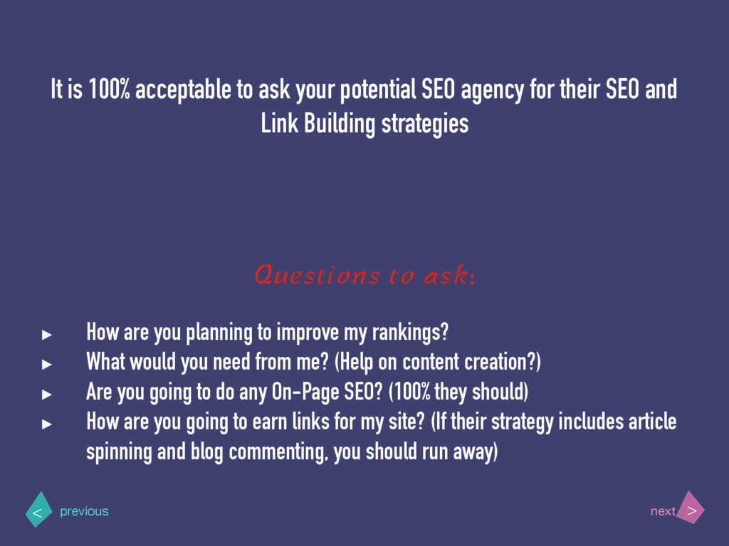 your potential SEO agency for their SEO and Link Building strategies Questions to ask: ‣ How are you planning to improve my rankings? ‣ What would you need from me? (Help on content creation?) ‣ Are you going to do any On-Page SEO? (100% they should) ‣ How are you going to earn links for my site? (If their strategy includes article spinning and blog commenting, you should run away)