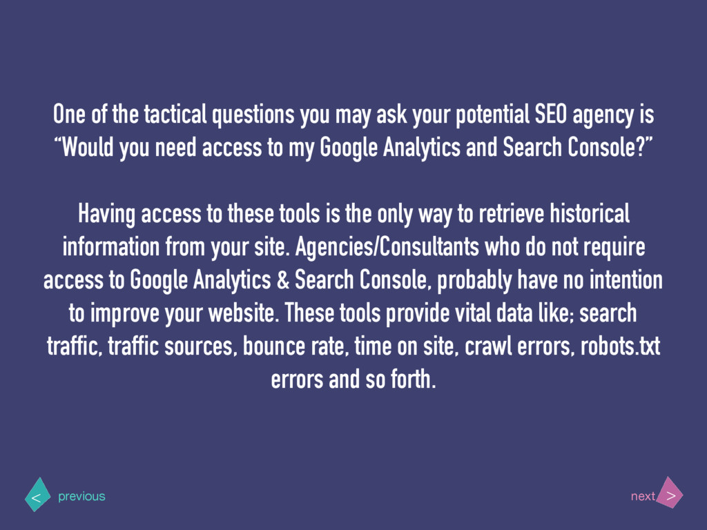 may ask your potential SEO agency is “Would you need access to my Google Analytics and Search Console?” Having access to these tools is the only way to retrieve historical information from your site. Agencies/Consultants who do not require access to Google Analytics & Search Console, probably have no intention to improve your website. These tools provide vital data like; search traffic, traffic sources, bounce rate, time on site, crawl errors, robots.txt errors and so forth.