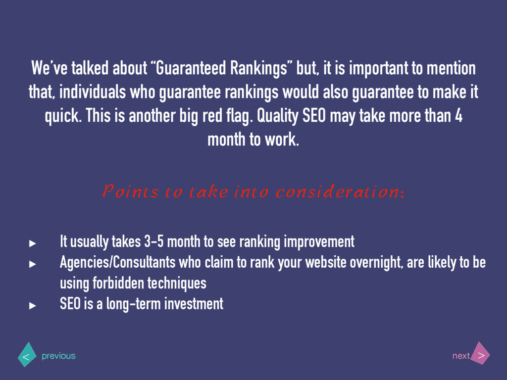 it is important to mention that, individuals who guarantee rankings would also guarantee to make it quick. This is another big red flag. Quality SEO may take more than 4 month to work. Points to take into consideration: ‣ It usually takes 3-5 month to see ranking improvement ‣ Agencies/Consultants who claim to rank your website overnight, are likely to be using forbidden techniques ‣ SEO is a long-term investment
