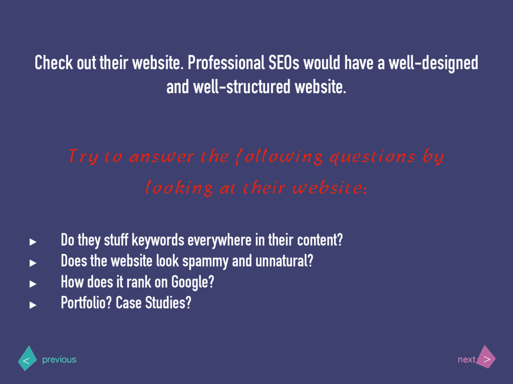 would have a well-designed and well-structured website. Try to answer the following questions by looking at their website: ‣ Do they stuff keywords everywhere in their content? ‣ Does the website look spammy and unnatural? ‣ How does it rank on Google? ‣ Portfolio? Case Studies?