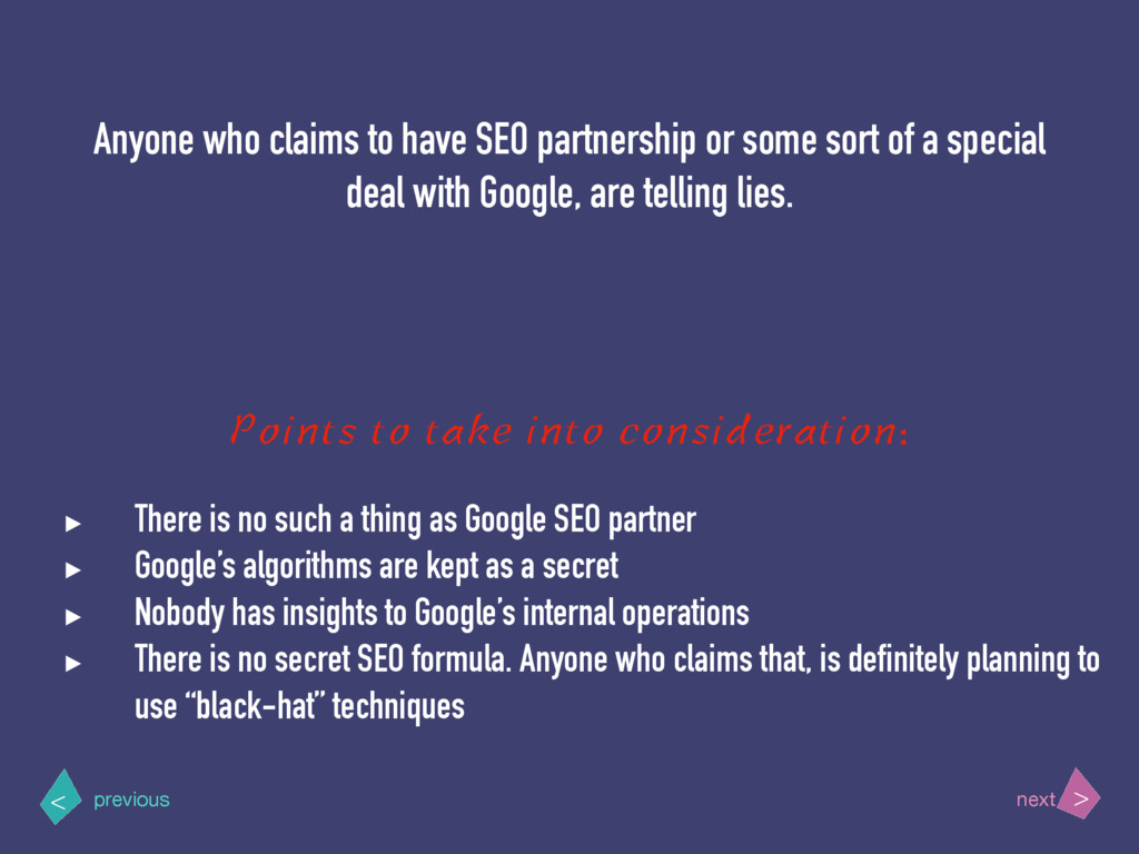 who claims to have SEO partnership or some sort of a special deal with Google, are telling lies. ‣ There is no such a thing as Google SEO partner ‣ Google’s algorithms are kept as a secret ‣ Nobody has insights to Google’s internal operations ‣ There is no secret SEO formula. Anyone who claims that, is definitely planning to use “black-hat” techniques