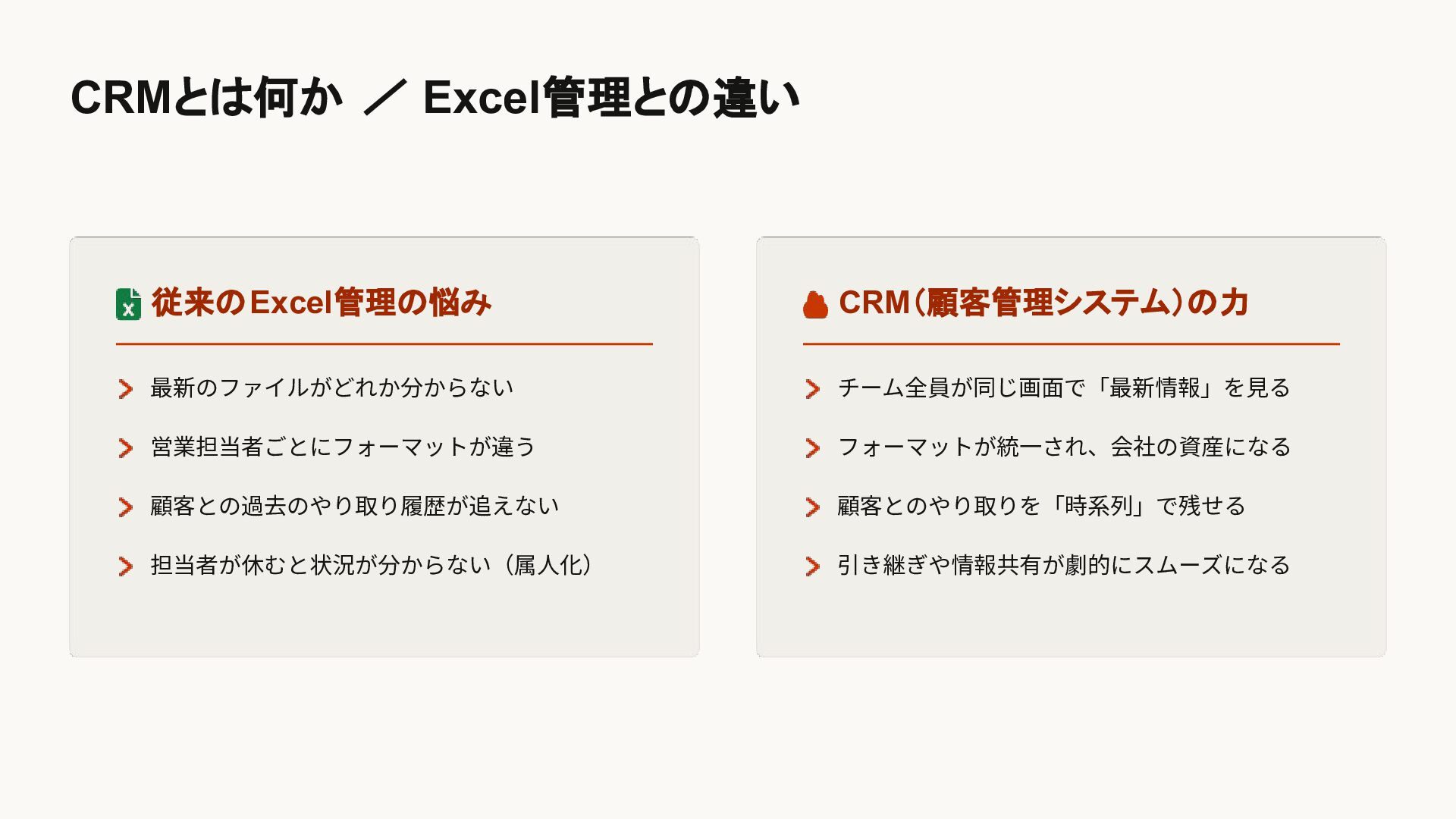 従来のExcel管理の悩み CRM(顧客管理システム)の力 最新のファイルがどれか分からない 営業担当者ごとにフォーマットが違う 顧客との過去のやり取り履歴が追えない 担当者が休むと状況が分からない(属⼈化) チーム全員が同じ画⾯で「最新情報」を⾒る フォーマットが統⼀され、会社の資産になる 顧客とのやり取りを「時系列」で残せる 引き継ぎや情報共有が劇的にスムーズになる