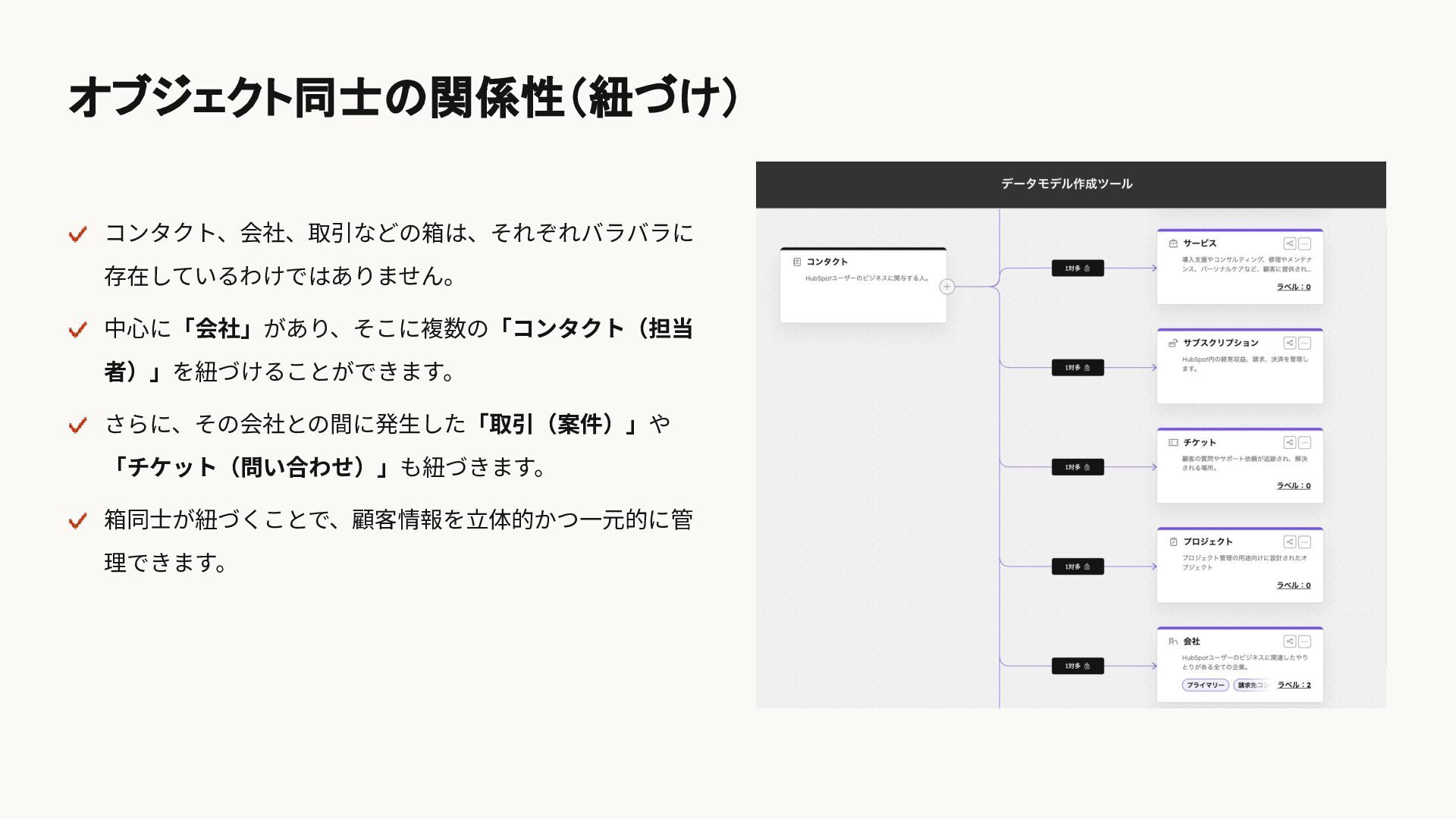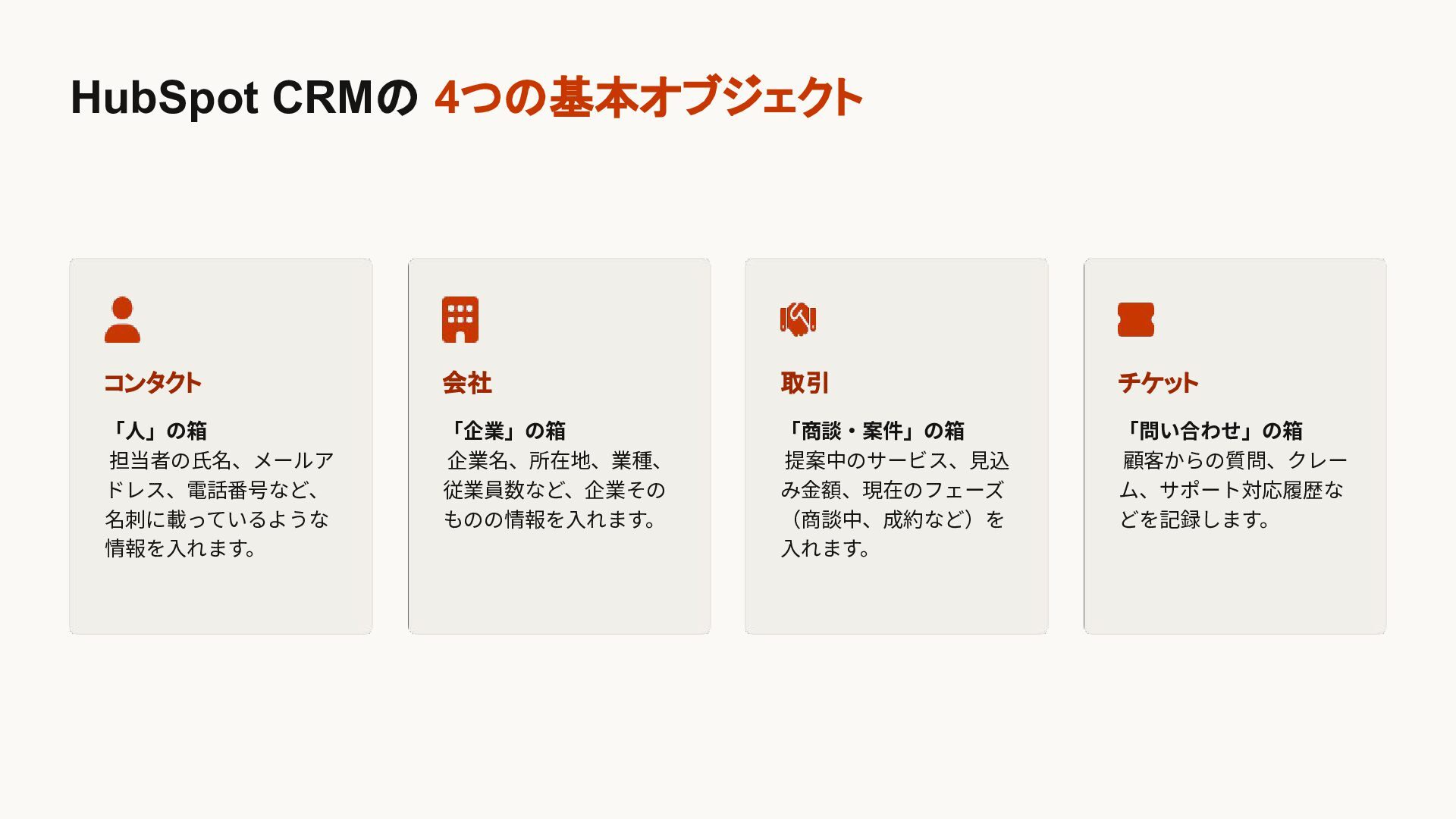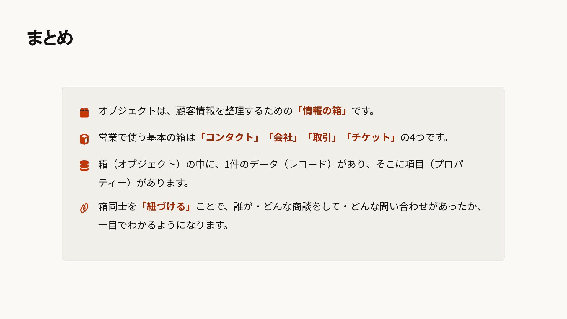 オブジェクトは、顧客情報を整理するための「情報の箱」です。 営業で使う基本の箱は「コンタクト」「会社」「取引」「チケット」の4つです。 箱(オブジェクト)の中に、1件のデータ(レコード)があり、そこに項⽬(プロパ ティー)があります。 箱同⼠を「紐づける」ことで、誰が‧どんな商談をして‧どんな問い合わせがあったか、 ⼀⽬でわかるようになります。 まとめ