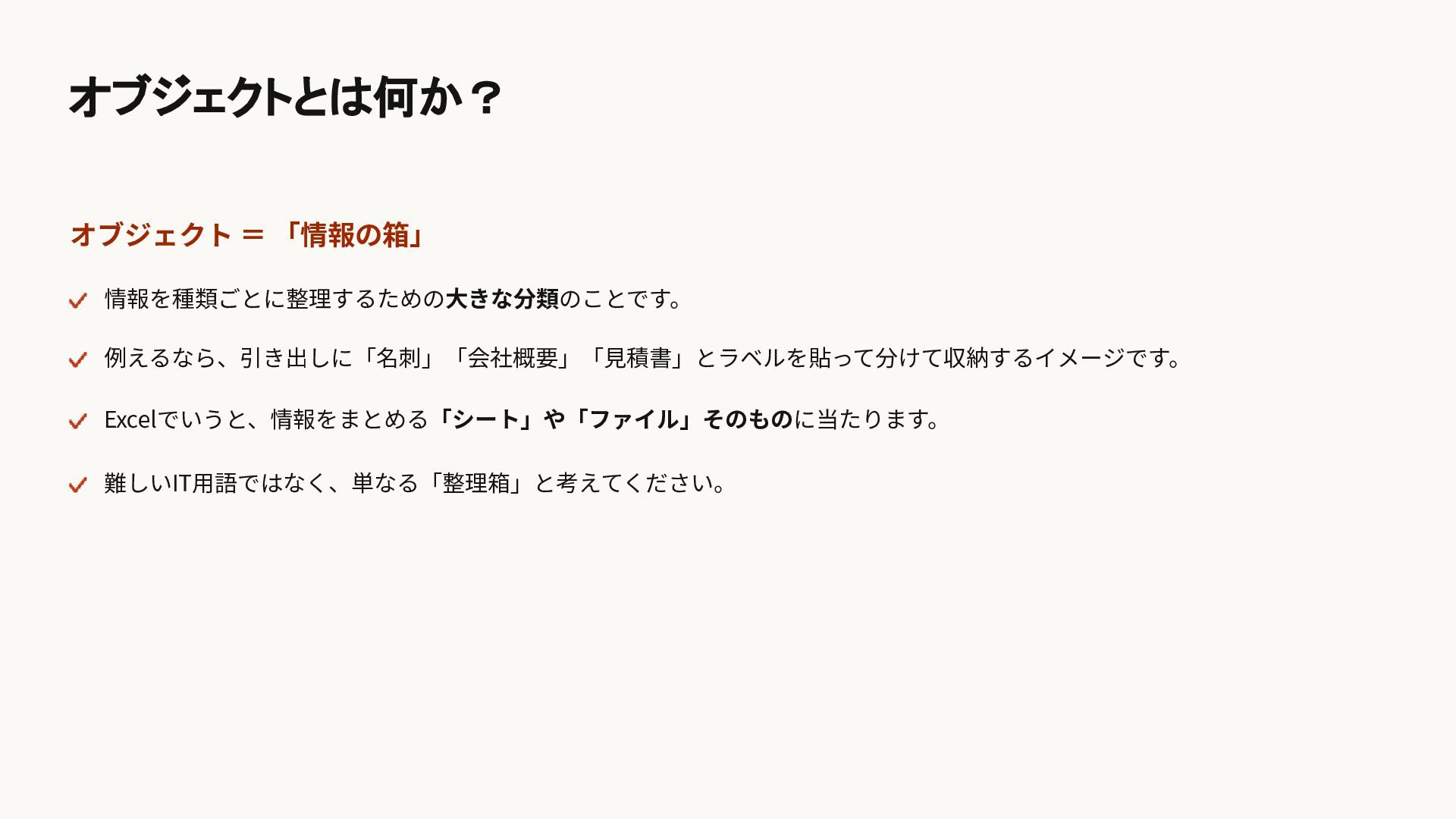 オブジェクト = 「情報の箱」 情報を種類ごとに整理するための⼤きな分類のことです。 例えるなら、引き出しに「名刺」「会社概要」「⾒積書」とラベルを貼って分けて収納するイメージです。 Excelでいうと、情報をまとめる「シート」や「ファイル」そのものに当たります。 難しいIT⽤語ではなく、単なる「整理箱」と考えてください。 オブジェクトとは何か?