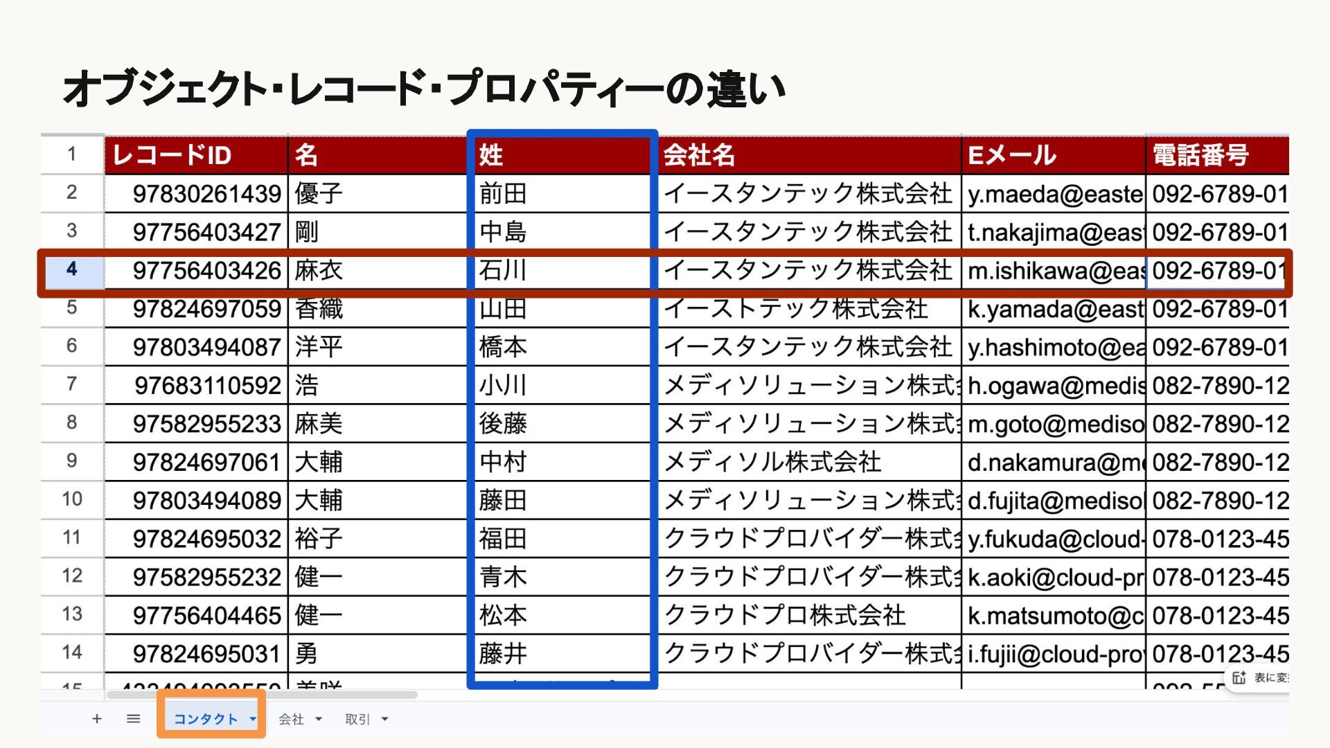 ⾏(横の列) 3. プロパティー(項目) ⽒名や電話番号など、⼊⼒する項⽬ 【Excelの例】 列(縦の⾒出し) オブジェクト・レコード・プロパティーの違い