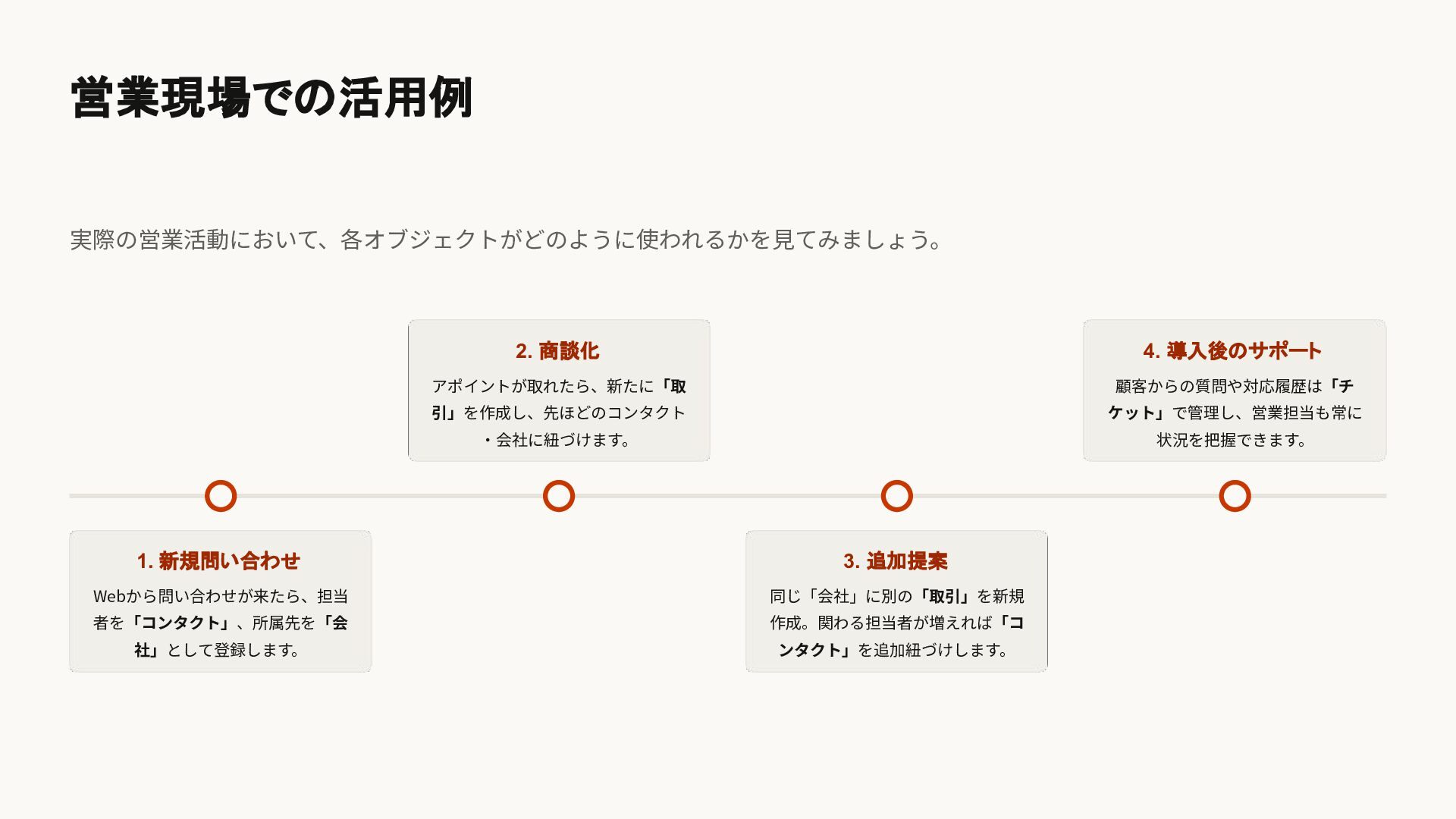 実際の営業活動において、各オブジェクトがどのように使われるかを⾒てみましょう。 1. 新規問い合わせ Webから問い合わせが来たら、担当 者を「コンタクト」、所属先を「会 社」として登録します。 2. 商談化 アポイントが取れたら、新たに「取 引」を作成し、先ほどのコンタクト
