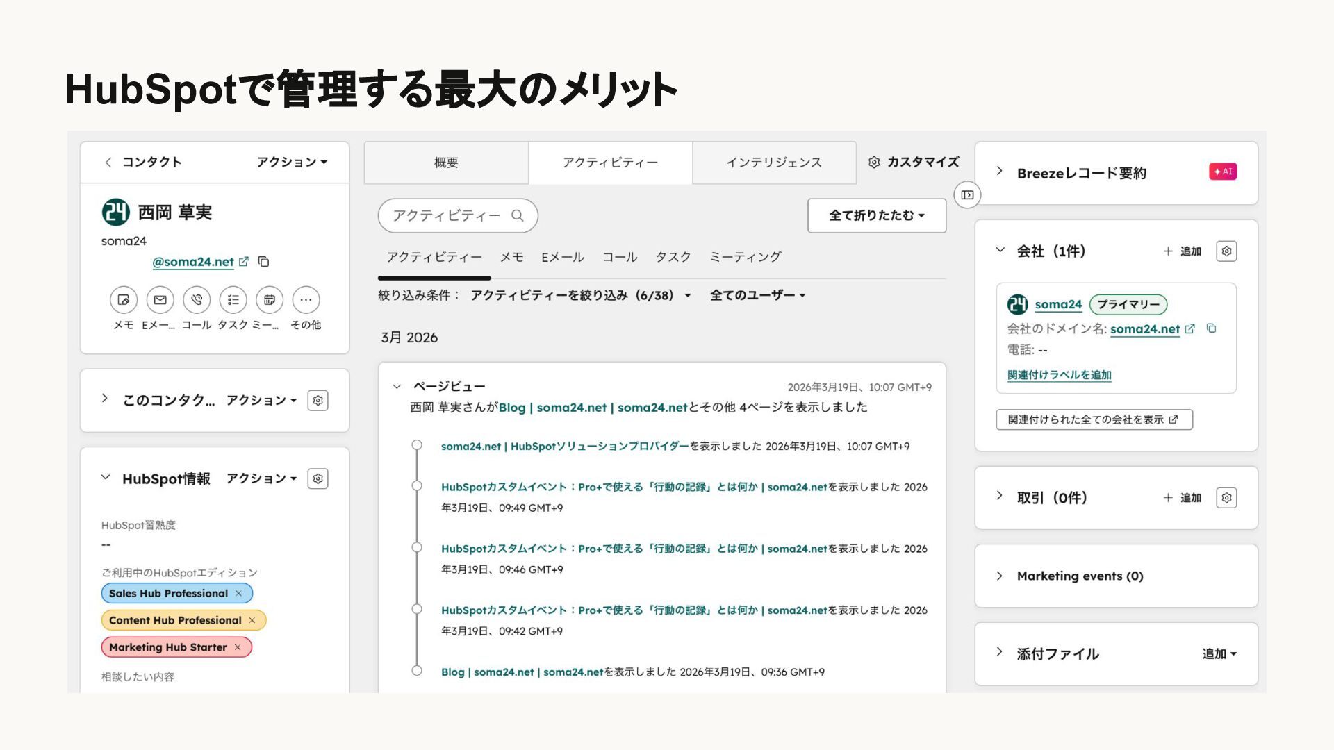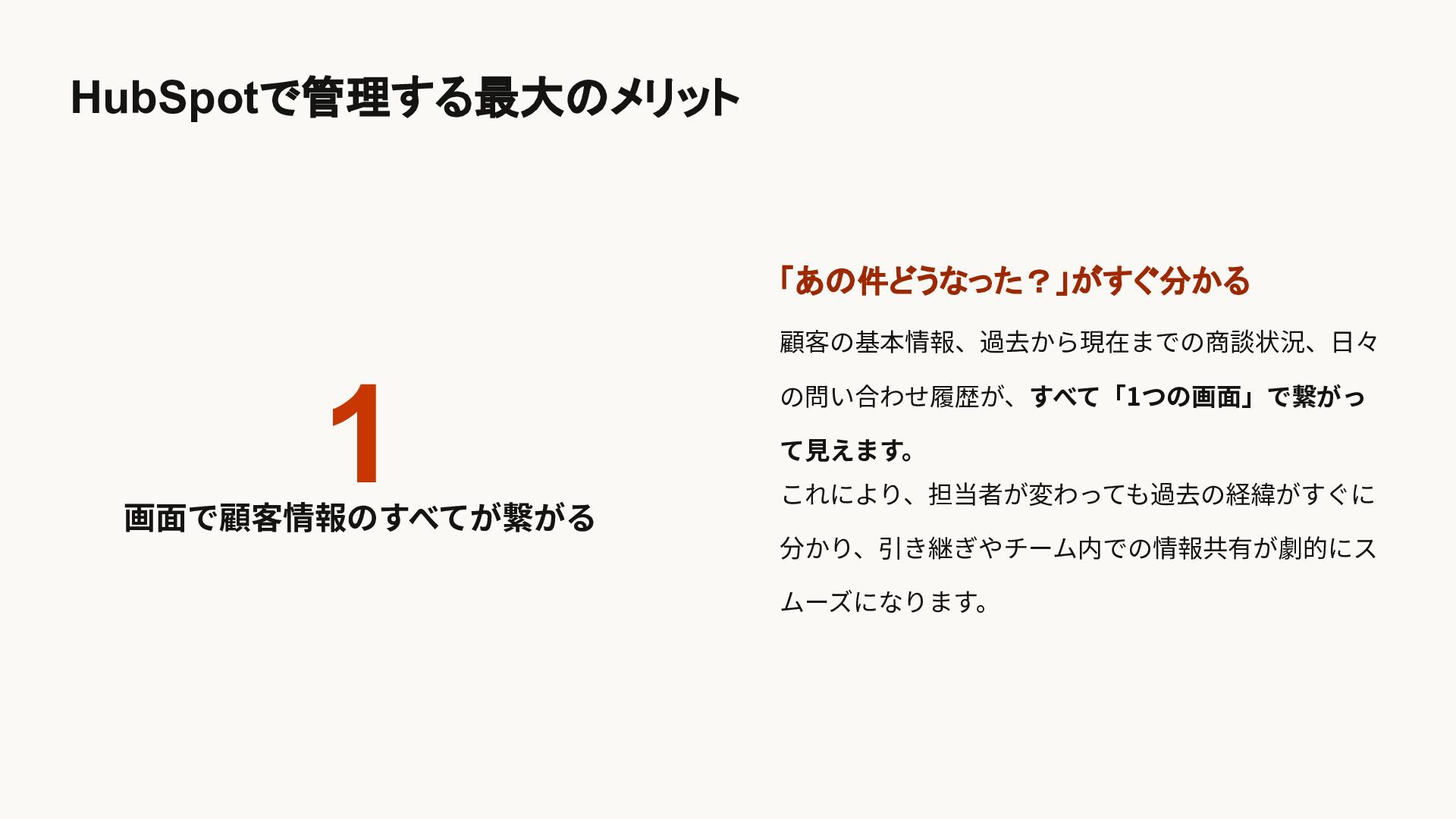 1 画⾯で顧客情報のすべてが繋がる 「あの件どうなった?」がすぐ分かる 顧客の基本情報、過去から現在までの商談状況、⽇々 の問い合わせ履歴が、すべて「1つの画⾯」で繋がっ て⾒えます。 これにより、担当者が変わっても過去の経緯がすぐに 分かり、引き継ぎやチーム内での情報共有が劇的にス ムーズになります。 HubSpotで管理する最大のメリット