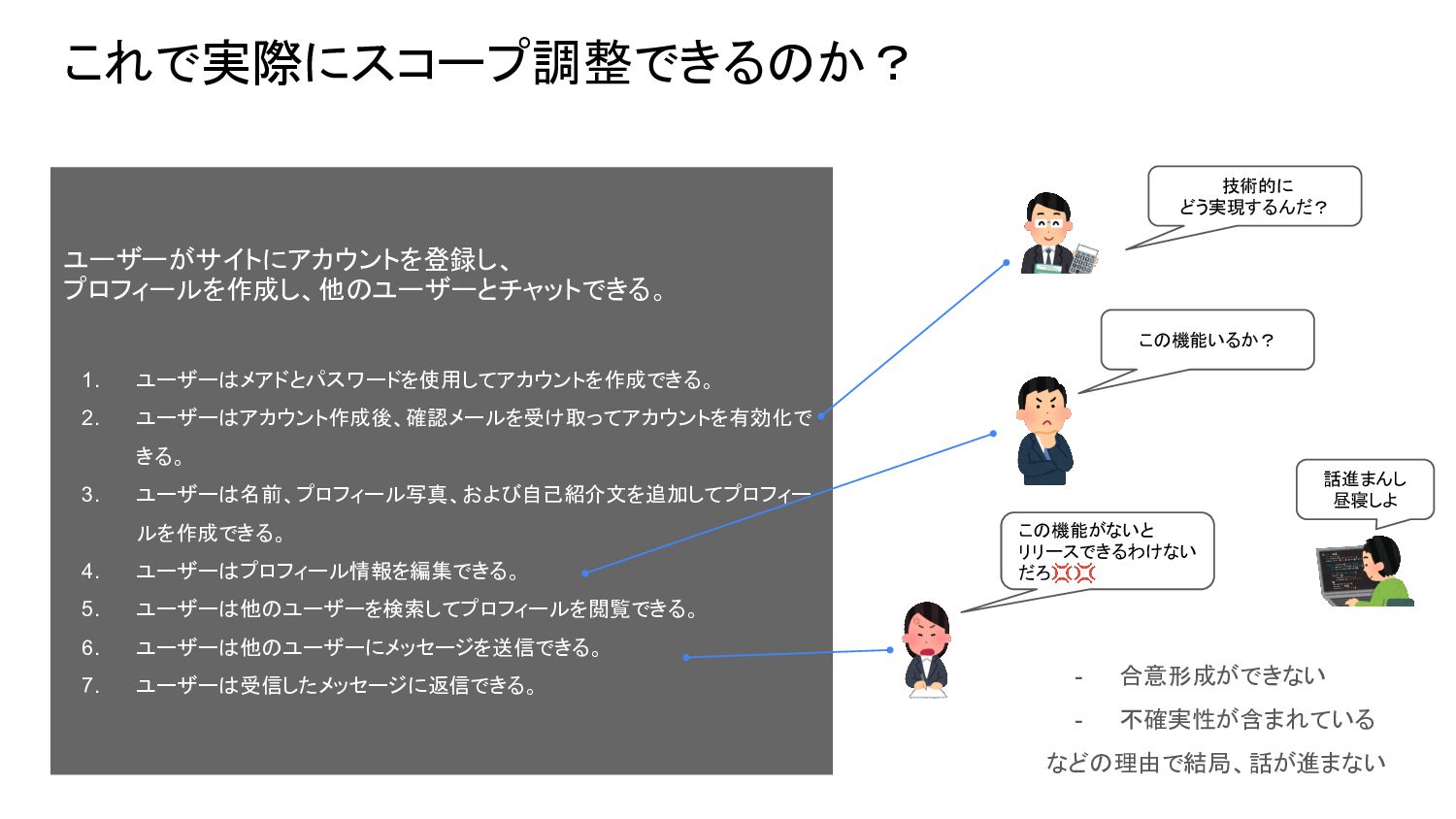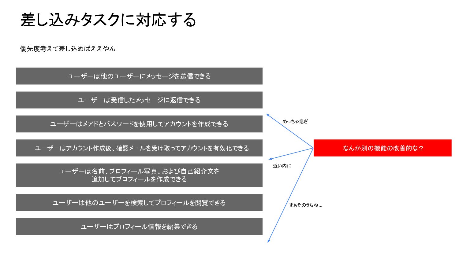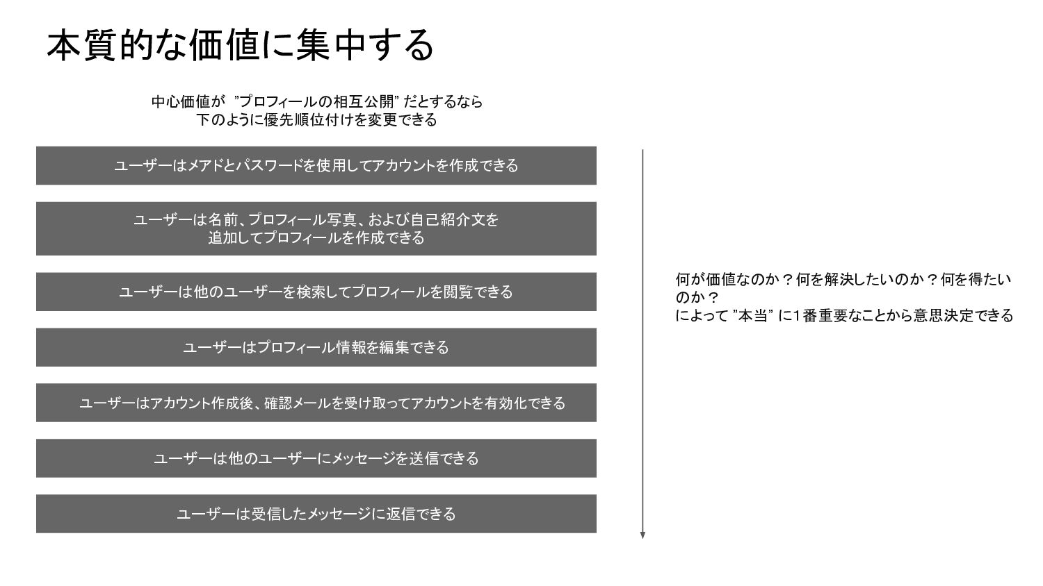 ユーザーはメアドとパスワードを使用してアカウントを作成できる。 2. ユーザーはアカウント作成後、確認メールを受け取ってアカウントを有効化で きる。 3. ユーザーは名前、プロフィール写真、および自己紹介文を追加してプロフィー ルを作成できる。 4. ユーザーはプロフィール情報を編集できる。 5. ユーザーは他のユーザーを検索してプロフィールを閲覧できる。 6. ユーザーは他のユーザーにメッセージを送信できる。 7. ユーザーは受信したメッセージに返信できる。 - 合意形成ができない - 不確実性が含まれている などの理由で結局、話が進まない 技術的に どう実現するんだ?