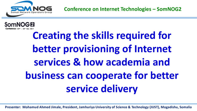 President, Jamhuriya University of Science & Technology (JUST), Mogadishu, Somalia Creating the skills required for better provisioning of Internet services & how academia and business can cooperate for better service delivery