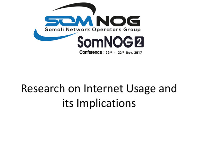 their users • This is enough motivation • What is next? – Design and execute a research project on Internet usage and penetration in Somalia – Build a steering committee that is all inclusive – Develop a participatory funding model