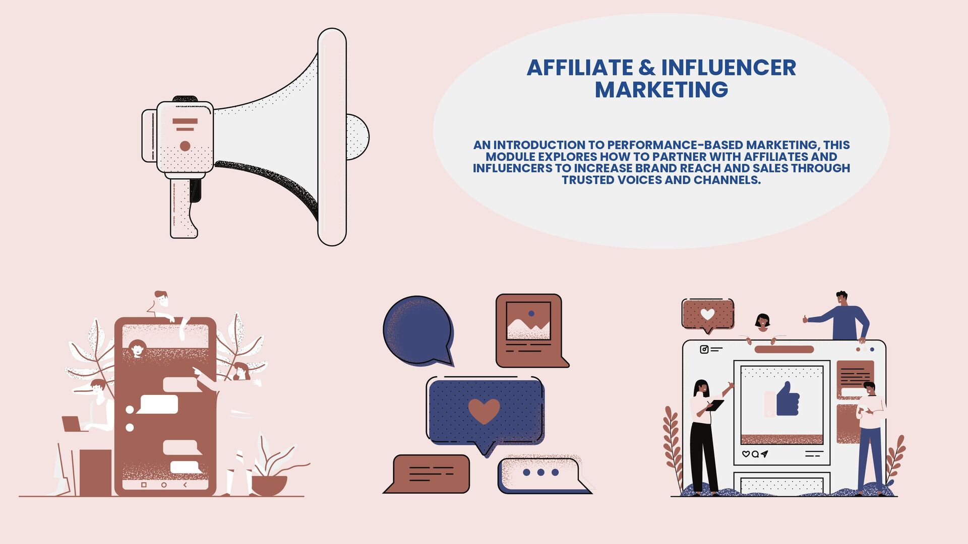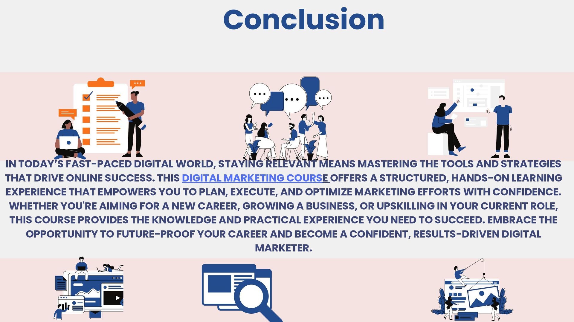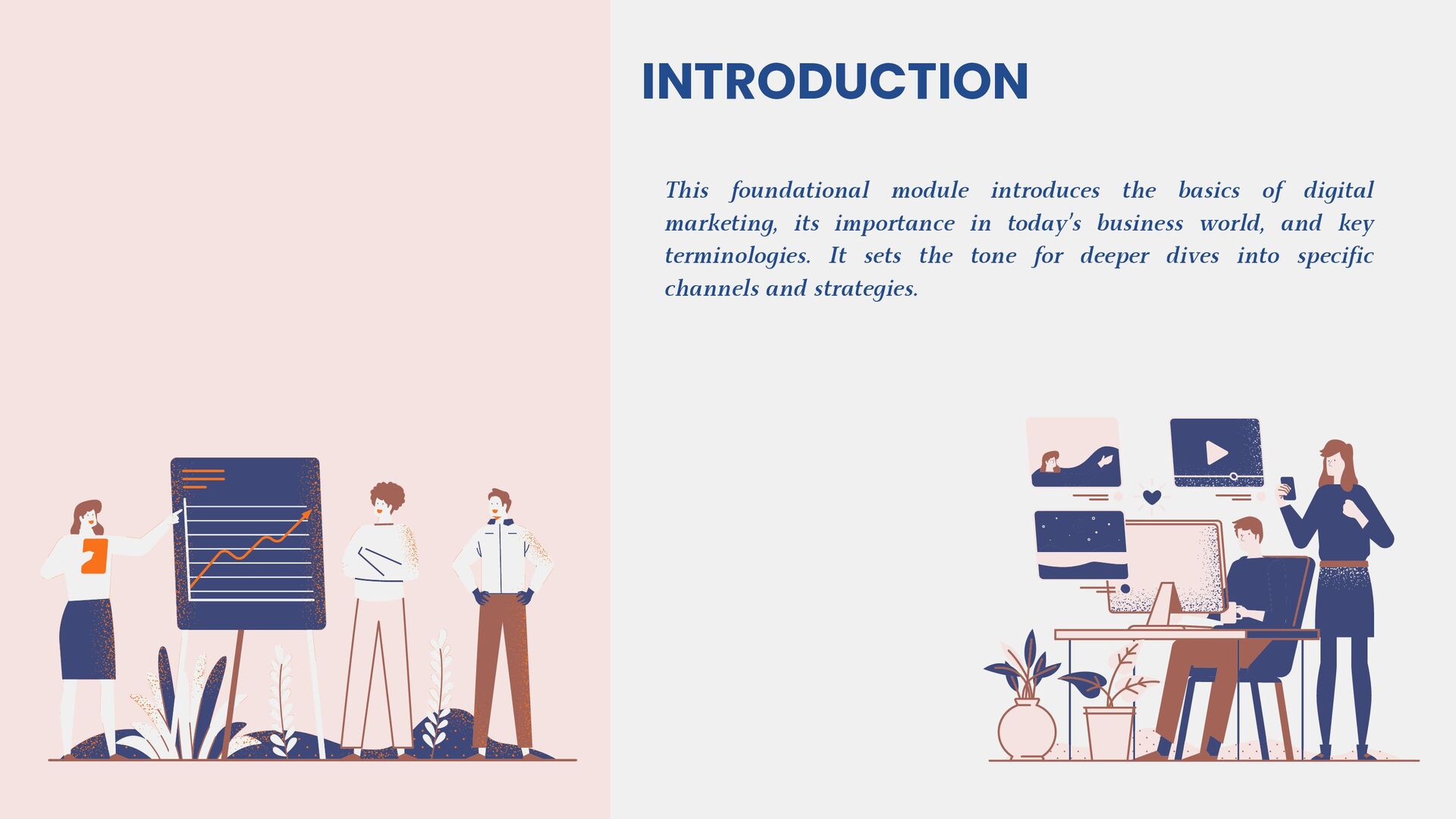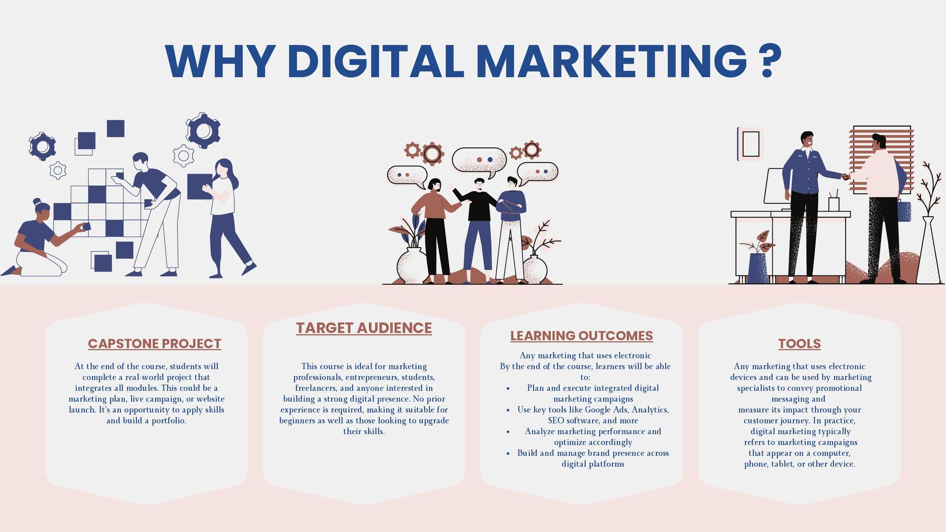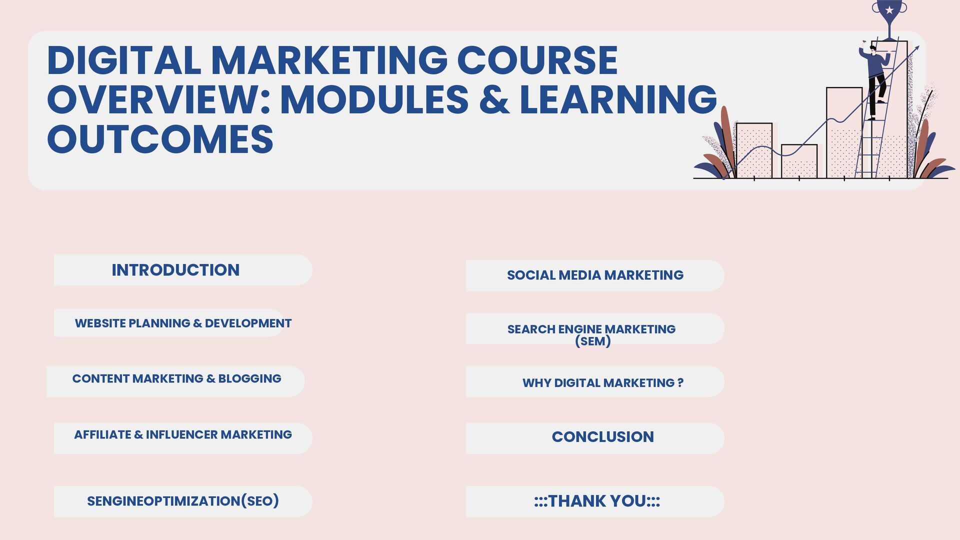 This slide provides a clear roadmap of the presentation, outlining all the major sections and modules that will be covered. It helps the audience understand the flow of the presentation and sets expectations for what they will learn. Each item listed represents a key component of the digital marketing course starting with foundational information and moving into specific modules, practical applications, and outcomes.