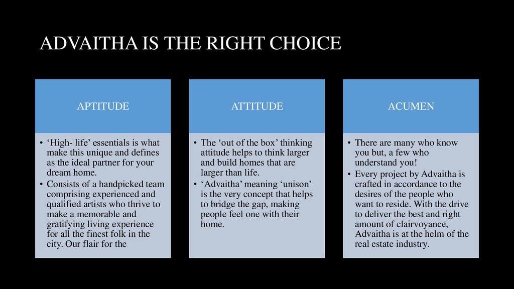 is what make this unique and defines as the ideal partner for your dream home. • Consists of a handpicked team comprising experienced and qualified artists who thrive to make a memorable and gratifying living experience for all the finest folk in the city. Our flair for the ATTITUDE • The ‘out of the box’ thinking attitude helps to think larger and build homes that are larger than life. • ‘Advaitha’ meaning ‘unison’ is the very concept that helps to bridge the gap, making people feel one with their home. ACUMEN • There are many who know you but, a few who understand you! • Every project by Advaitha is crafted in accordance to the desires of the people who want to reside. With the drive to deliver the best and right amount of clairvoyance, Advaitha is at the helm of the real estate industry.