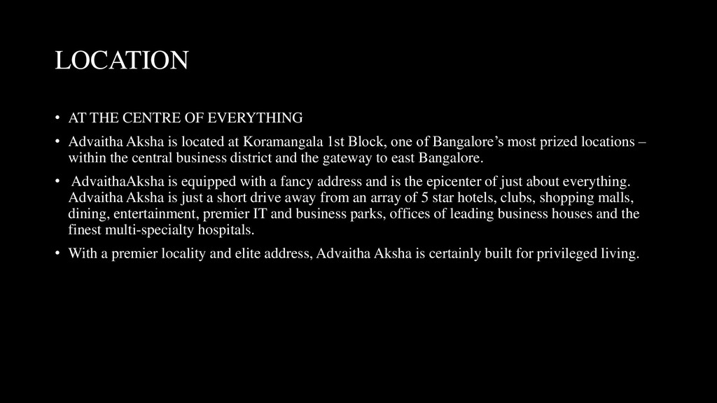 is located at Koramangala 1st Block, one of Bangalore’s most prized locations – within the central business district and the gateway to east Bangalore. • AdvaithaAksha is equipped with a fancy address and is the epicenter of just about everything. Advaitha Aksha is just a short drive away from an array of 5 star hotels, clubs, shopping malls, dining, entertainment, premier IT and business parks, offices of leading business houses and the finest multi-specialty hospitals. • With a premier locality and elite address, Advaitha Aksha is certainly built for privileged living.