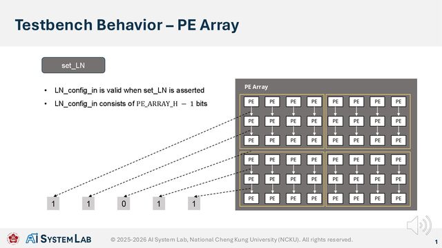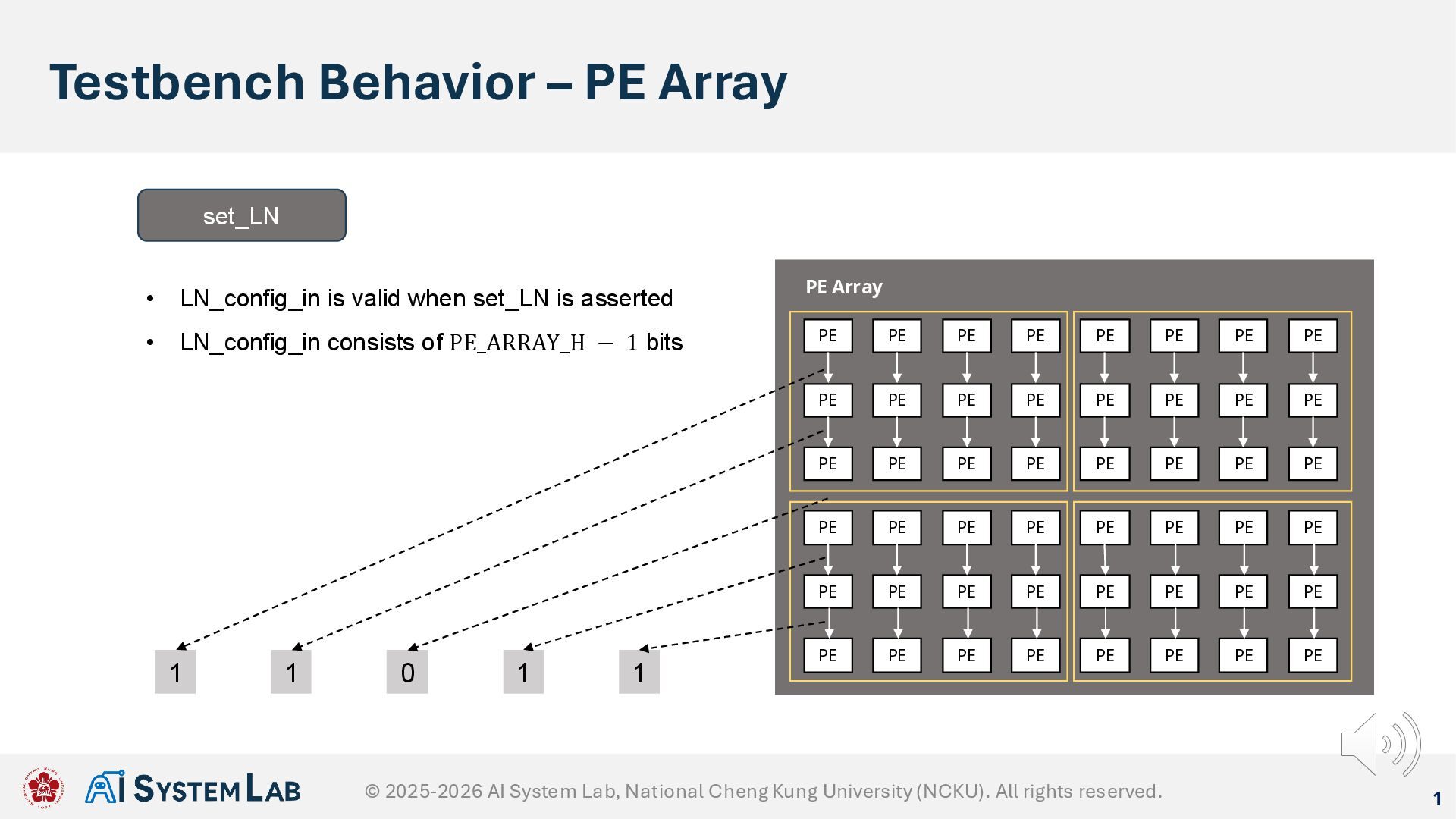 PE PE PE PE PE PE PE PE PE PE PE PE PE PE PE PE PE PE PE PE PE PE PE PE PE PE PE PE PE PE PE PE PE PE PE PE PE PE PE PE PE PE PE PE PE PE set_LN • LN_config_in is valid when set_LN is asserted • LN_config_in consists of PE_ARRAY_H − 1 bits 1 1 0 1 1 © 2025-2026 AI System Lab, National Cheng Kung University (NCKU). All rights reserved.