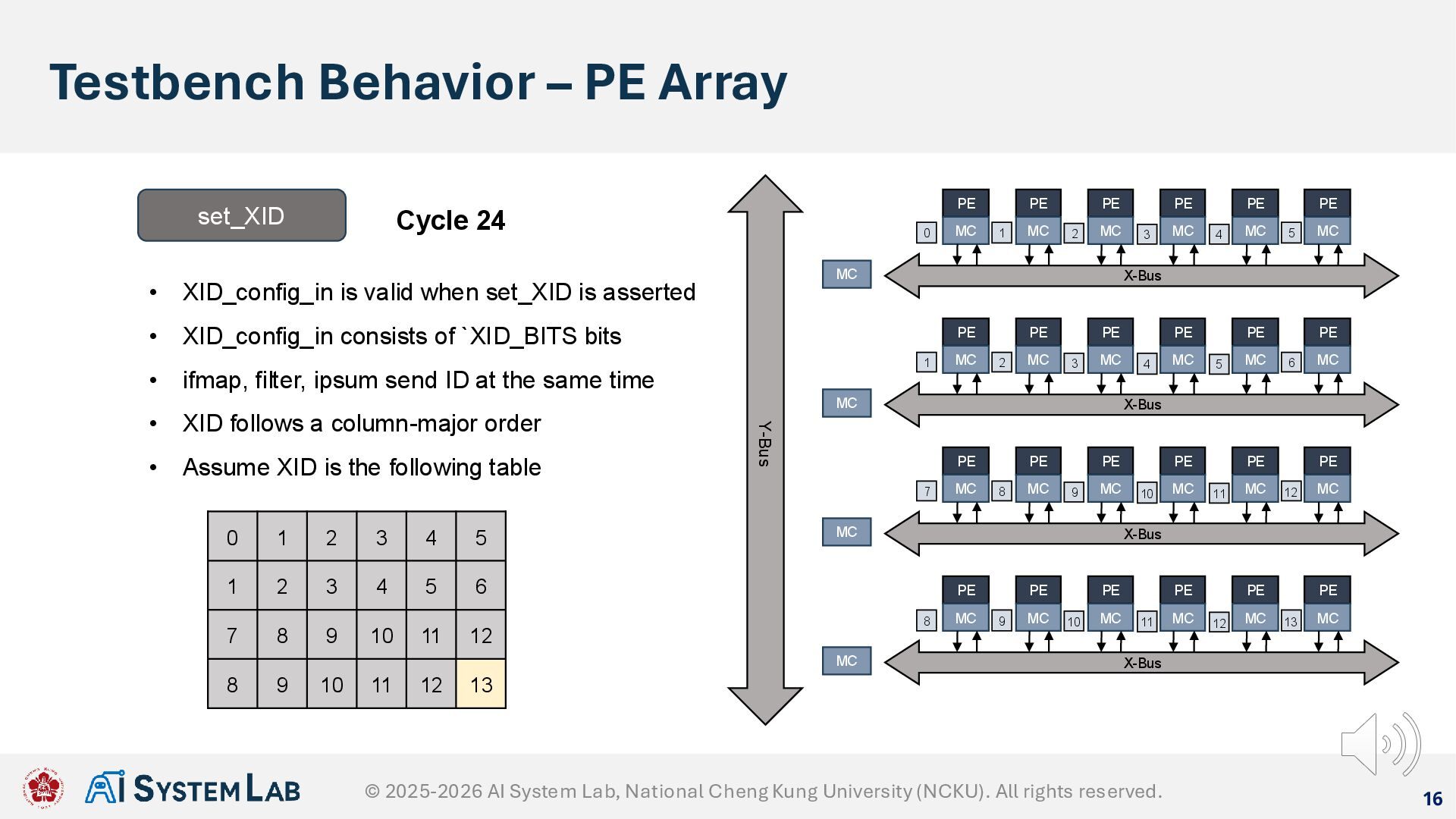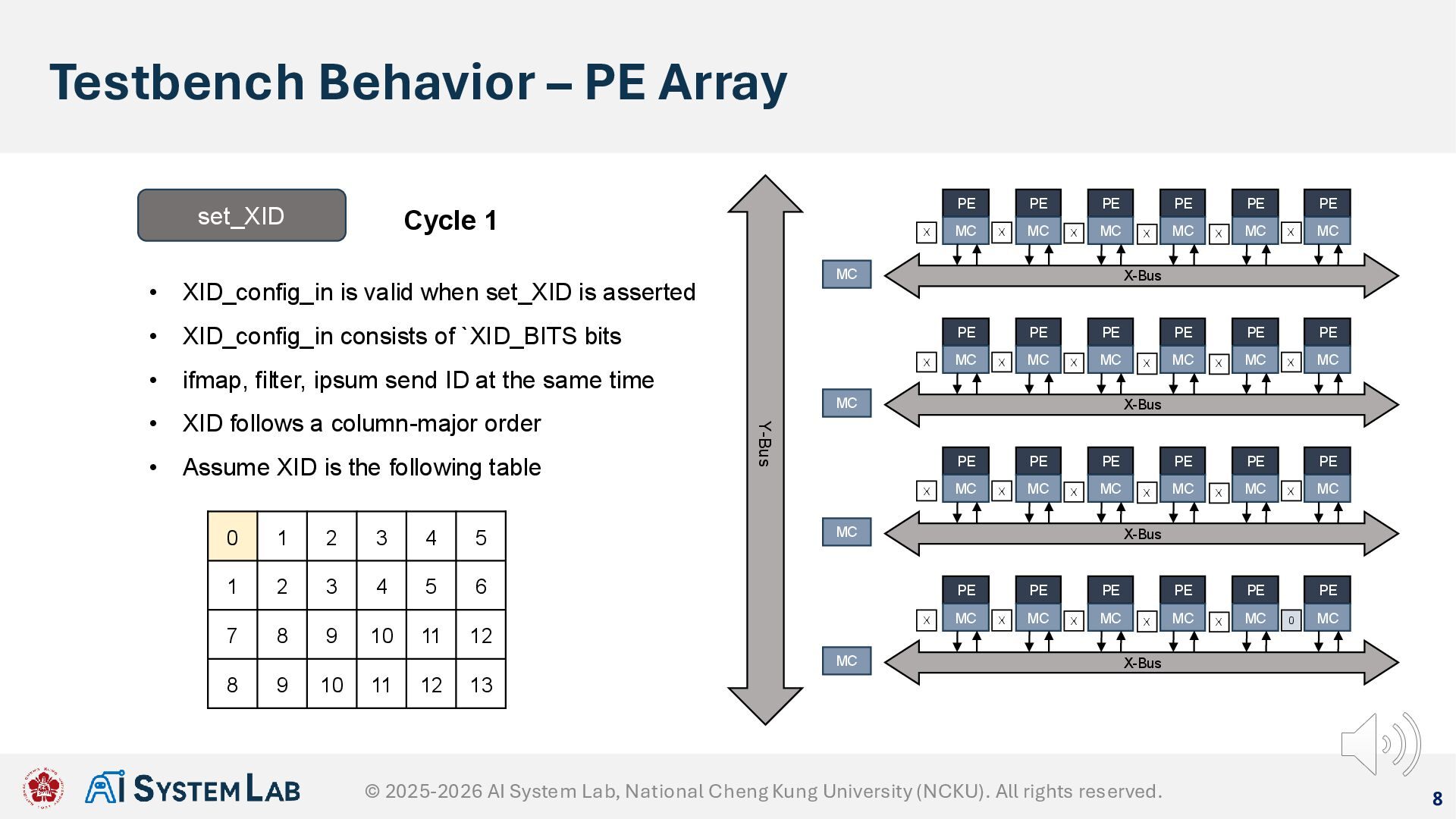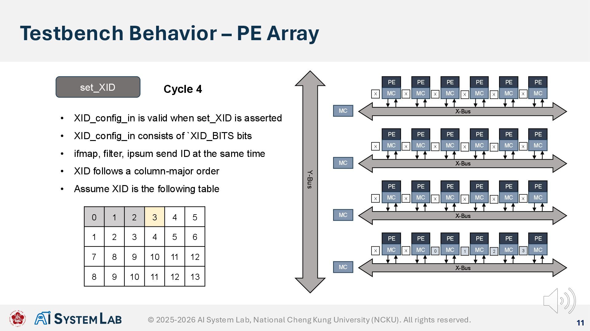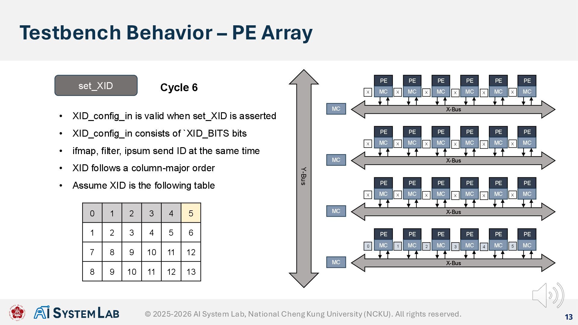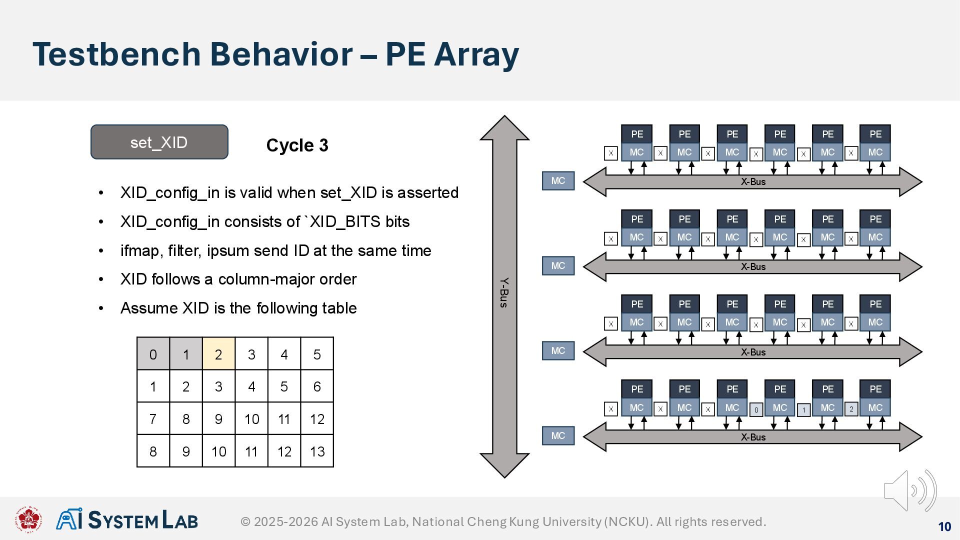 valid when set_XID is asserted • XID_config_in consists of `XID_BITS bits • ifmap, filter, ipsum send ID at the same time • XID follows a column-major order • Assume XID is the following table X Cycle 0 X X X X X X X X X X X X X X X X X X X X X X X 0 1 2 3 4 5 1 2 3 4 5 6 7 8 9 10 11 12 8 9 10 11 12 13 Y-Bus MC X-Bus PE MC PE MC PE MC PE MC PE MC PE MC MC X-Bus PE MC PE MC PE MC PE MC PE MC PE MC MC X-Bus PE MC PE MC PE MC PE MC PE MC PE MC MC X-Bus PE MC PE MC PE MC PE MC PE MC PE MC © 2025-2026 AI System Lab, National Cheng Kung University (NCKU). All rights reserved.