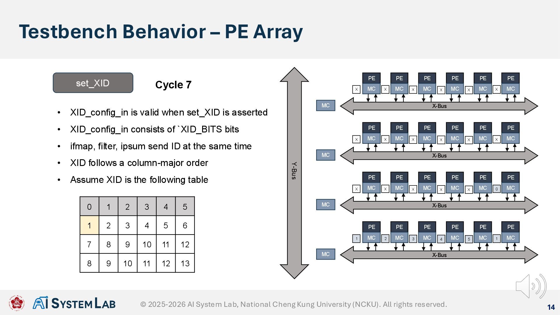 X X X X X X X X X X X X X X X X X X X X X X 0 • XID_config_in is valid when set_XID is asserted • XID_config_in consists of `XID_BITS bits • ifmap, filter, ipsum send ID at the same time • XID follows a column-major order • Assume XID is the following table 0 1 2 3 4 5 1 2 3 4 5 6 7 8 9 10 11 12 8 9 10 11 12 13 Y-Bus MC X-Bus PE MC PE MC PE MC PE MC PE MC PE MC MC X-Bus PE MC PE MC PE MC PE MC PE MC PE MC MC X-Bus PE MC PE MC PE MC PE MC PE MC PE MC MC X-Bus PE MC PE MC PE MC PE MC PE MC PE MC © 2025-2026 AI System Lab, National Cheng Kung University (NCKU). All rights reserved.