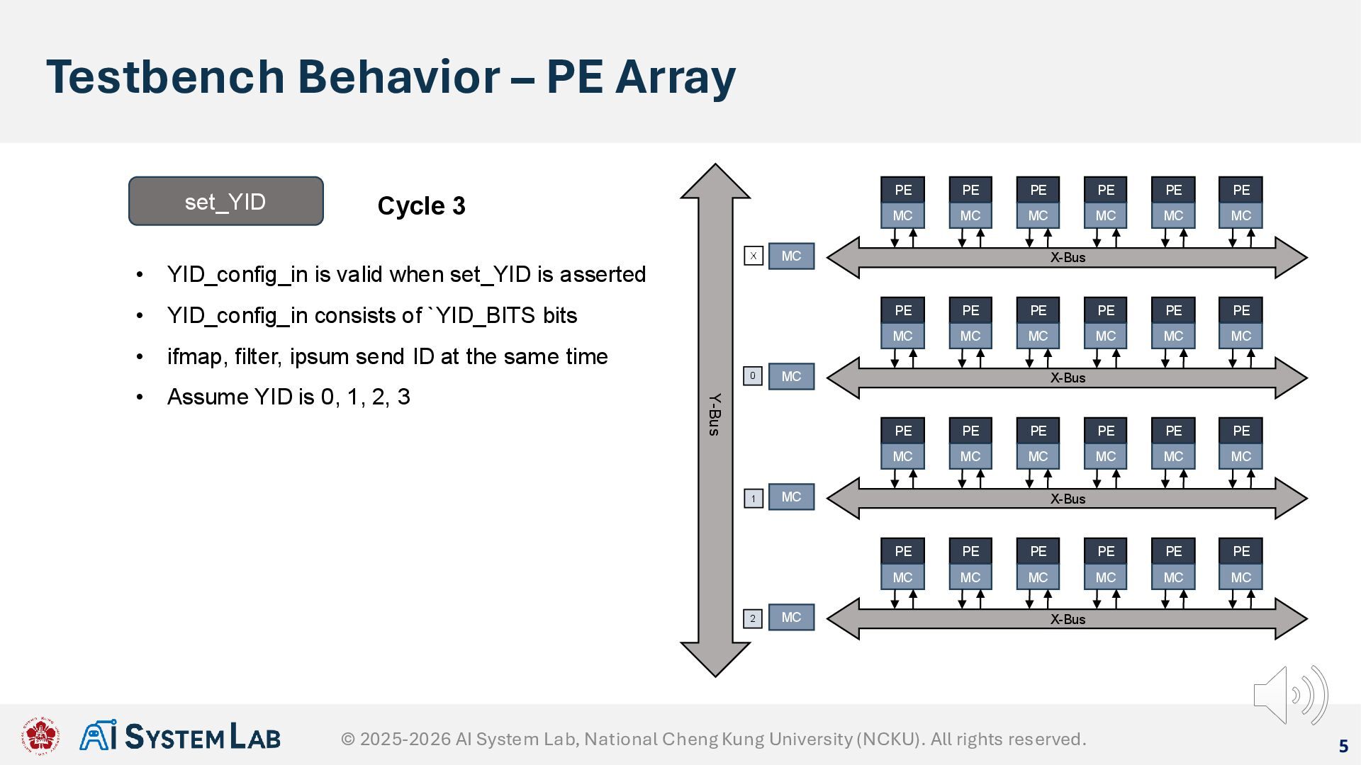 PE MC PE MC PE MC PE MC PE MC PE MC MC X-Bus PE MC PE MC PE MC PE MC PE MC PE MC MC X-Bus PE MC PE MC PE MC PE MC PE MC PE MC MC X-Bus PE MC PE MC PE MC PE MC PE MC PE MC X X X X Cycle 0 • YID_config_in is valid when set_YID is asserted • YID_config_in consists of `YID_BITS bits • ifmap, filter, ipsum send ID at the same time • Assume YID is 0, 1, 2, 3 © 2025-2026 AI System Lab, National Cheng Kung University (NCKU). All rights reserved.