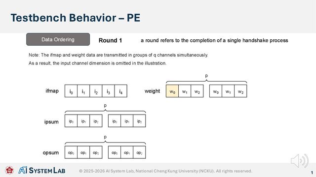 ifmap w0 w1 w2 weight ipsum Data Ordering Round 1 a round refers to the completion of a single handshake process Note: The ifmap and weight data are transmitted in groups of q channels simultaneously. As a result, the input channel dimension is omitted in the illustration. w0 w1 w2 p ip0 ip1 ip2 ip0 ip1 ip2 p op0 op1 op2 op0 op1 op2 p opsum © 2025-2026 AI System Lab, National Cheng Kung University (NCKU). All rights reserved.