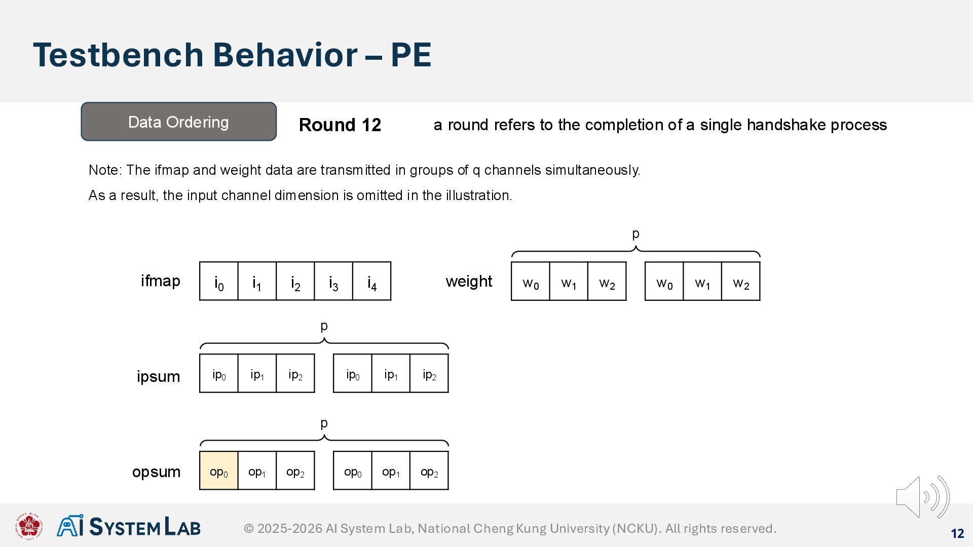ifmap w0 w1 w2 weight ipsum Data Ordering Round 11 a round refers to the completion of a single handshake process Note: The ifmap and weight data are transmitted in groups of q channels simultaneously. As a result, the input channel dimension is omitted in the illustration. w0 w1 w2 p ip0 ip1 ip2 ip0 ip1 ip2 p op0 op1 op2 op0 op1 op2 p opsum © 2025-2026 AI System Lab, National Cheng Kung University (NCKU). All rights reserved.