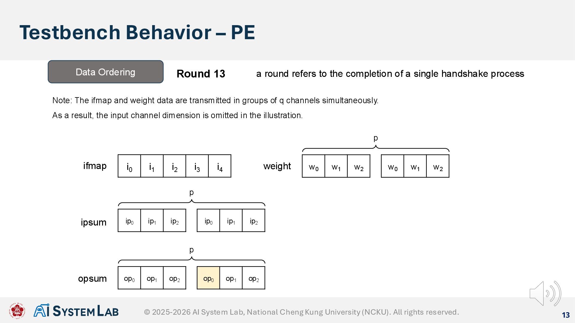 ifmap w0 w1 w2 weight ipsum Data Ordering Round 12 a round refers to the completion of a single handshake process Note: The ifmap and weight data are transmitted in groups of q channels simultaneously. As a result, the input channel dimension is omitted in the illustration. w0 w1 w2 p ip0 ip1 ip2 ip0 ip1 ip2 p op0 op1 op2 op0 op1 op2 p opsum © 2025-2026 AI System Lab, National Cheng Kung University (NCKU). All rights reserved.