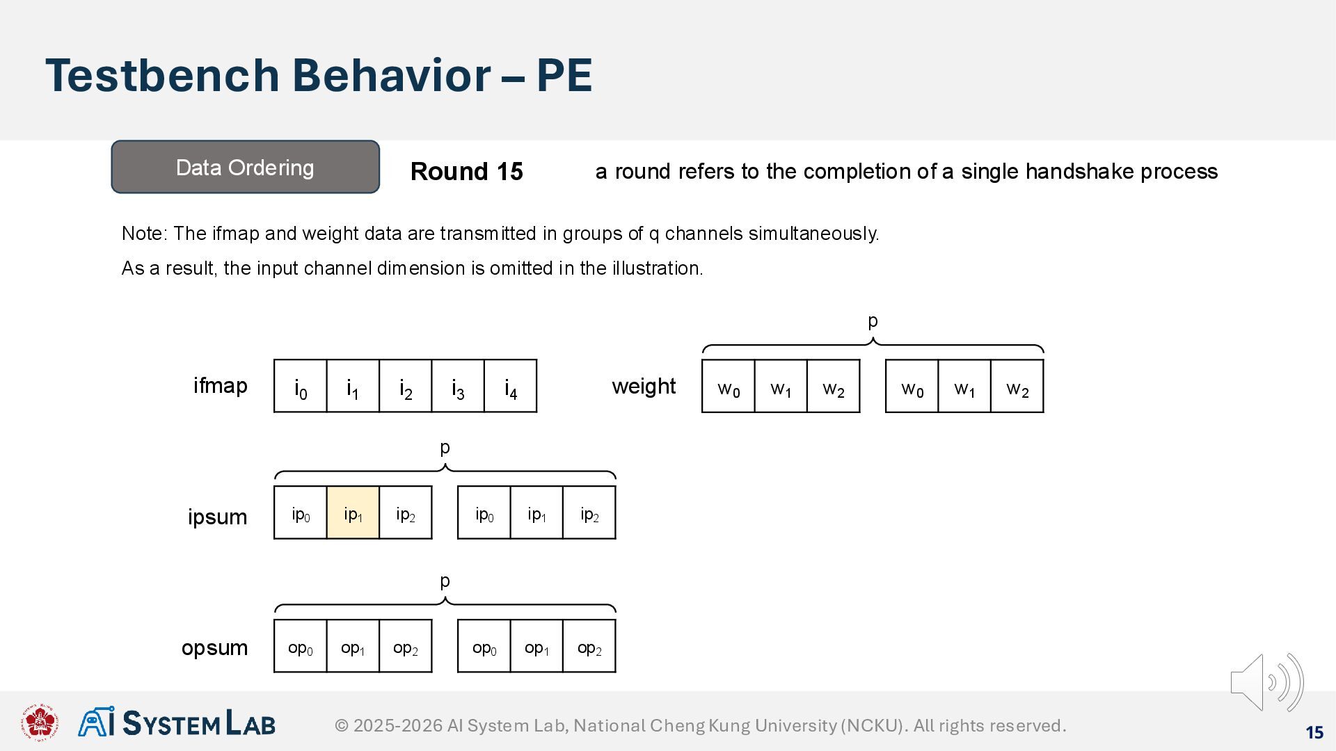 ifmap w0 w1 w2 weight ipsum Data Ordering Round 14 a round refers to the completion of a single handshake process Note: The ifmap and weight data are transmitted in groups of q channels simultaneously. As a result, the input channel dimension is omitted in the illustration. w0 w1 w2 p ip0 ip1 ip2 ip0 ip1 ip2 p op0 op1 op2 op0 op1 op2 p opsum © 2025-2026 AI System Lab, National Cheng Kung University (NCKU). All rights reserved.